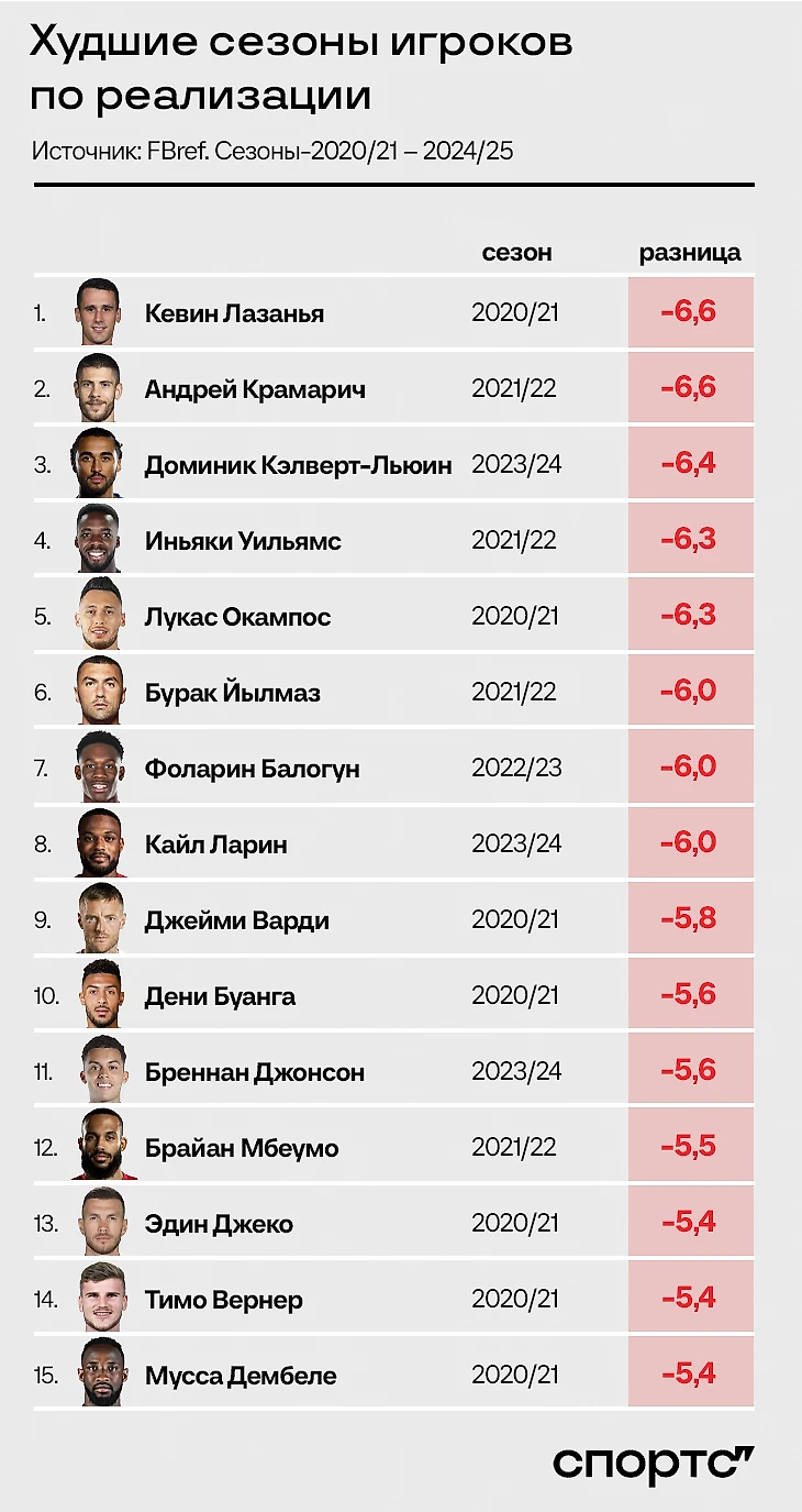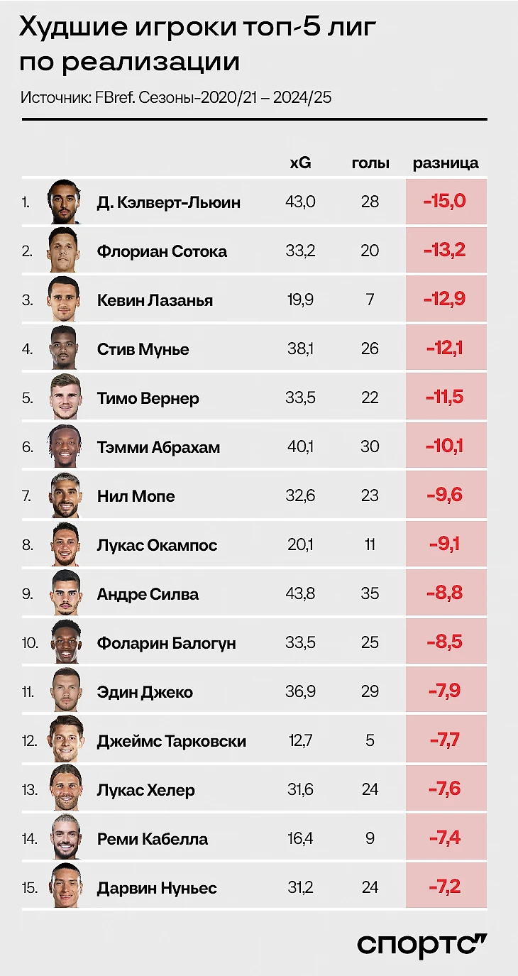 ● Антитоп возглавил Доминик Калверт-Льюин. Форвард «Эвертона» вот уже шесть сезонов подряд забивает меньше ожидаемого. Иронично, но недобрал даже в самый результативный год: при 16 голах в сезоне-2020/21 имел 16,3 xG с игры.