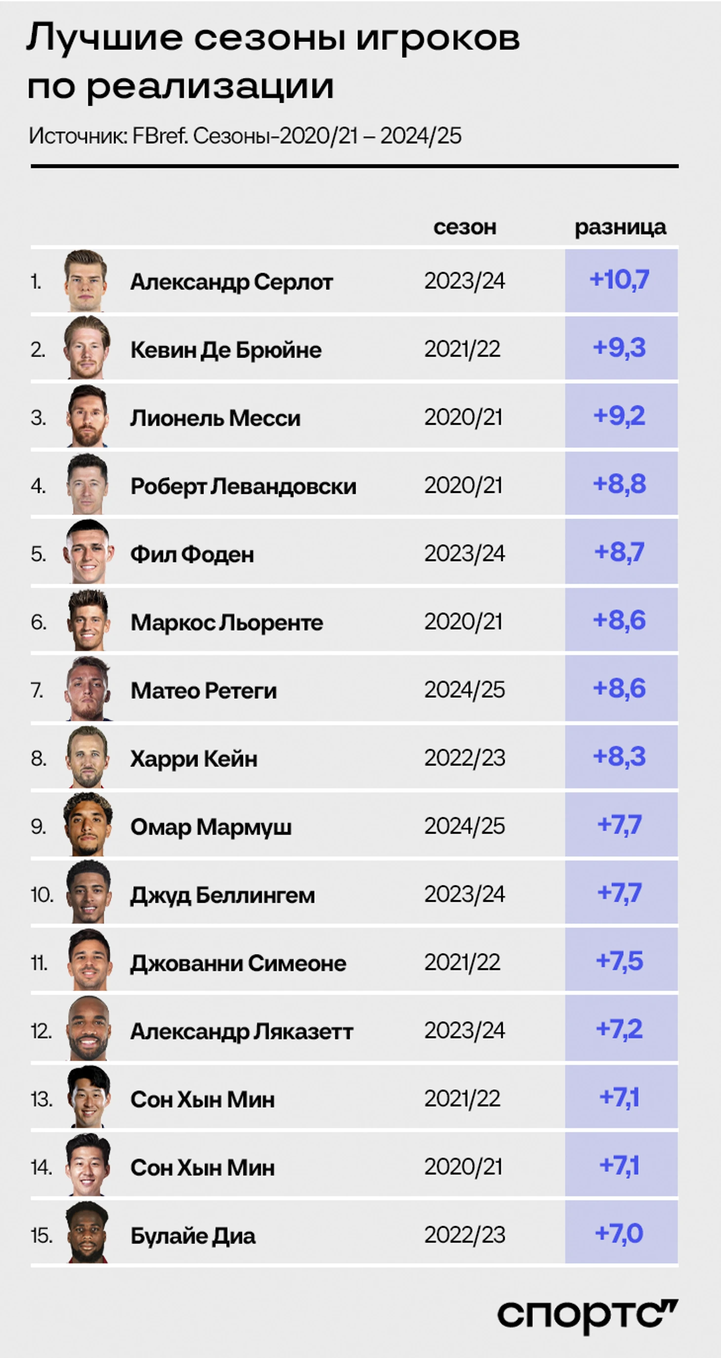 ● Герои сезона-2024/25 – Матео Ретеги и Омар Мармуш. Египтянин обгонял xG в Бундеслиге и пока что делает то же самое в «Ман Сити» (+2,0 при трех голах). Фан-факт: из 15 голов в Бундеслиге Мармуш забил 13 ударами в левый от себя угол. Предсказуемо, но эффективно.