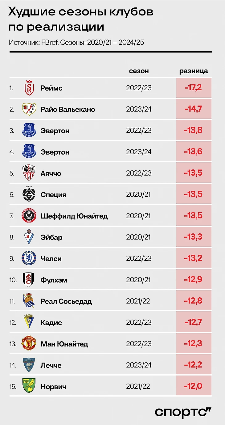 ● Совет для игроков атаки: ни в коем случае не переходите в «Эвертон». Два сезона подряд с двузначной отрицательной реализацией! Cейчас дела заметно лучше – реализация все еще в минусе, но совсем небольшом – 2,6.