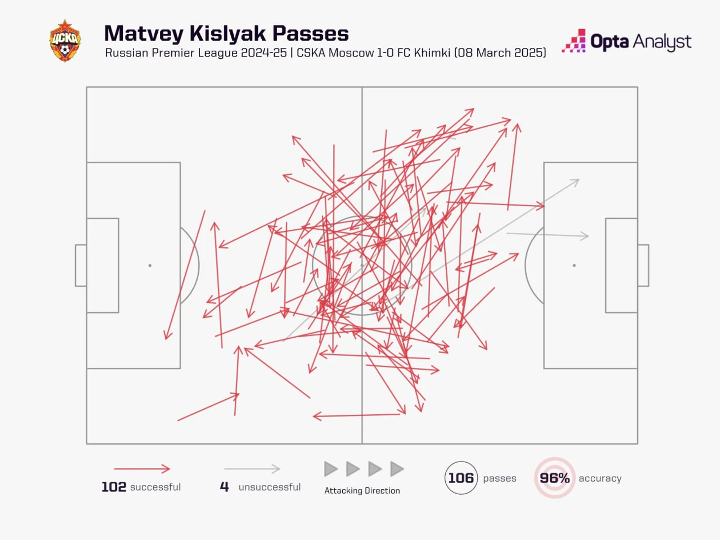 Матвей Кисляк – один из героев матча. Opta подсчитала, что полузащитник ЦСКА отдал больше сотни передач с 96-процентной точностью. Вот так выглядит их карта.