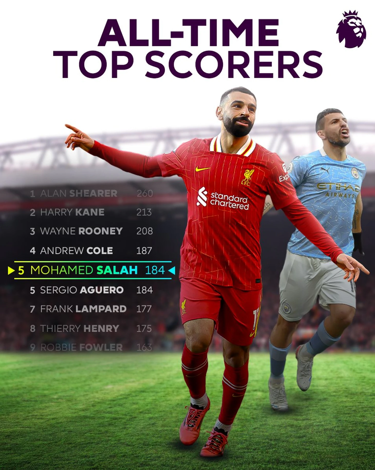 Дубль Салаха позволил ему разделить с Серхио Агуэро пятую строчку в рейтинге лучших бомбардиров в истории АПЛ, оба забили по 184 гола.