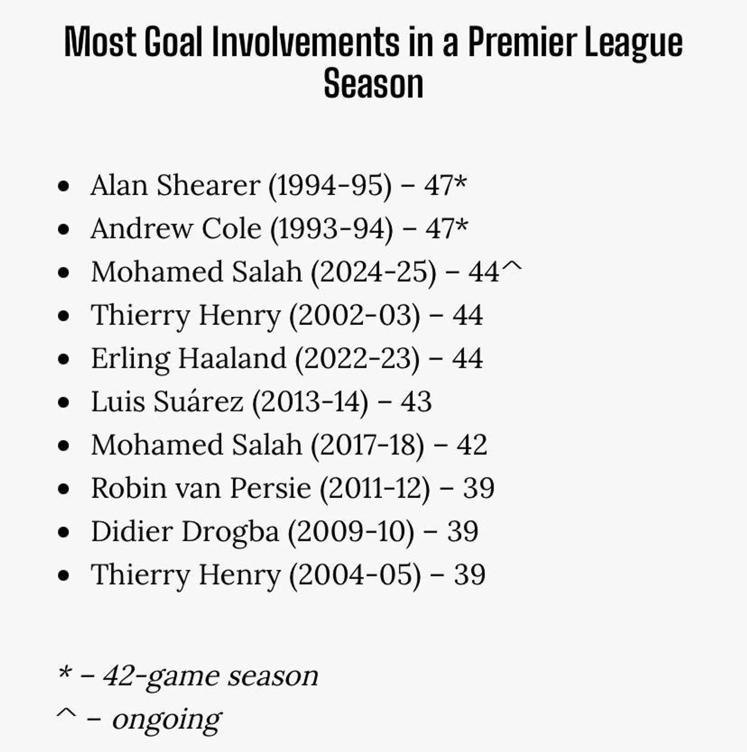 Пока у Мо 44 результативных действий в АПЛ – это рекорд, который вингер «Ливерпуля» делит с Эрлингом Холандом и Тьерри Анри. Больше по «гол+пас» набирали только Алан Ширер и Энди Коул: они оба пересекли отметку в 47 голевых действий, но в тех сезонах было по 42 матча.