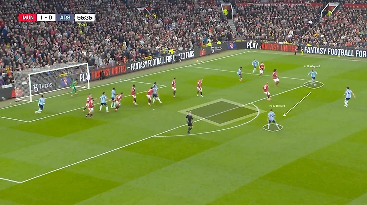 В следующем эпизоде упрекать игроков «Арсенала» за плохое принятие решений точно не следует. Эдегор увидел свободного Троссарда, который имел достаточно времени, чтобы не только обработать мяч, но и улучшить позицию для удара. А вот сам удар получился откровенно плохим.