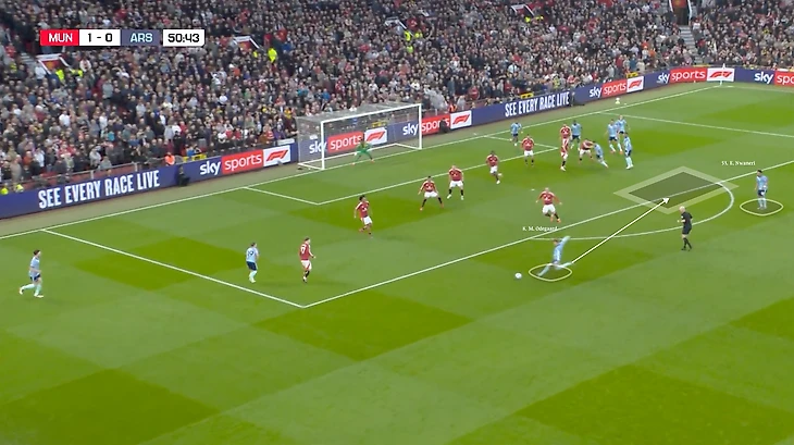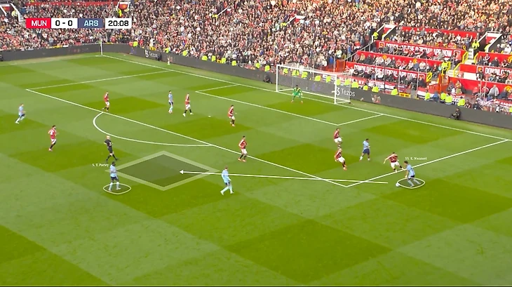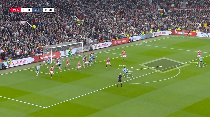 Многие удары в исполнении игроков «Арсенала» не стали опасными, но сами позиции для ударов были перспективными. Игроки «Юнайтед» часто прижимались к своим воротам, оставляя опорную свободной. В этом сезоне «Арсенал» уже наказывал соперников за такую свободу. Самый яркий пример реализации такого рода моментов случился в гостевом матче против «Астон Виллы». Защитники «Виллы» вжались к вратарской, оставив в опорной Томаса Парти, поразившего ближний угол.