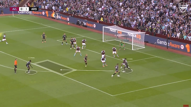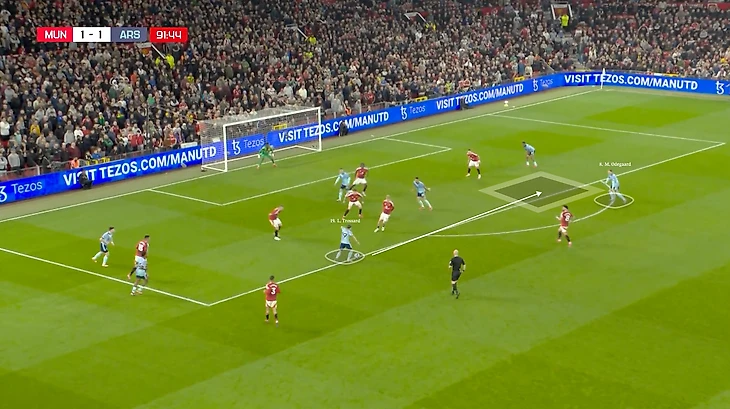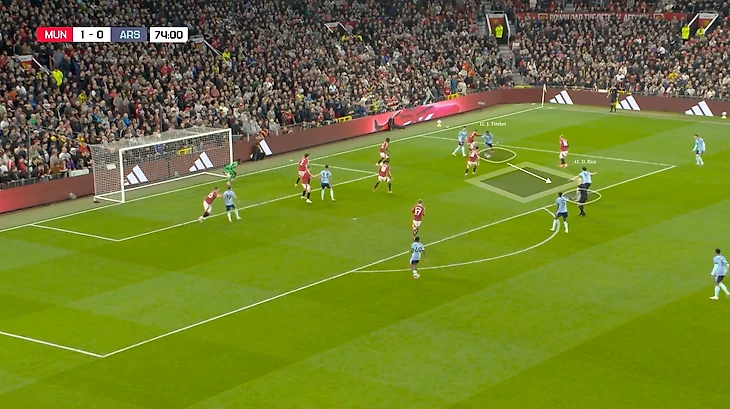 Во втором тайме задумка использовать опорную читалась и при стандартах. После короткого розыгрыша углового Мартин Эдегор мог забить один из лучших голов сезона, но после удара в одно касание мяч полетел выше дальнего угла. В этом эпизоде было более тонкое решение – отпасовать под удар свободному Нванери. Итан имел полную свободу в эпизоде и к тому же славится дальними ударами из этой зоны.