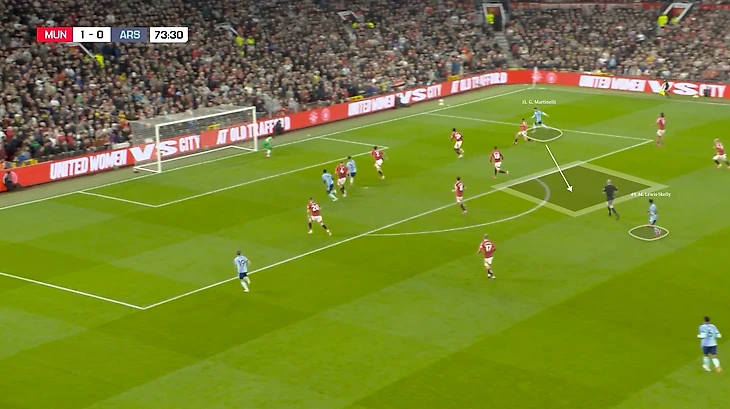 Неплохо вышедший на замену Мартинелли в целом делал все правильно – проход по флангу, прострел. Проблема в том, что для успешного прострела мяч должен был пролететь сразу через Мазрауи, Хэвена и Линделёфа. По итогу Хэвен выбил мяч в подкате.