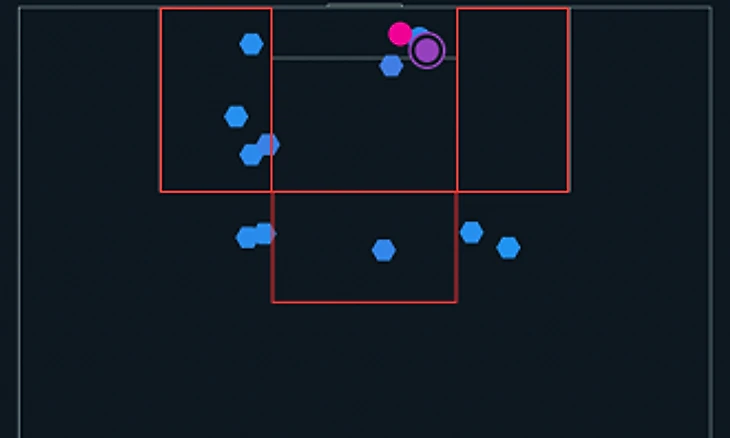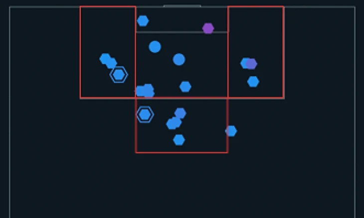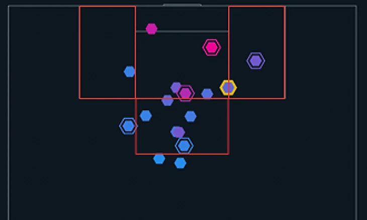 Множество ударов из пределов штрафной равномерно распределенных по всем зонам. При этом почти все ситуации, в которых наносились удары, не были опасными – чем ближе цвет к голубому, тем ниже вероятность забить. Основной фактор – большое скопление защитников «Вест Хэма» перед мячом.