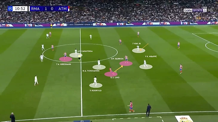 Тчуамени вынужден разрываться между Лино и Барриосом. Мбаппе должен был или закрыть линию передачи на Лино, или плотно играть с Барриосом. Но Килиан не сделал ни первого, ни второго, из-за чего «Атлетико» в две передачи вывел мяч в центр.