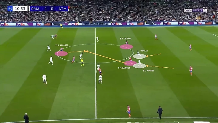 Гризманн пользуется ситуацией и уводит за собой Камавингу, а Тчуамени вынужден играть по Лино – это открывает зону в полузащите для Хулиана Альвареса, который делает движение назад (ни один из ЦЗ «Мадрида» не рискует идти за ним, чтобы не открыть зону за спиной), а Барриос и Де Поль полностью свободны, так как Винисиус и Мбаппе запаздывают.