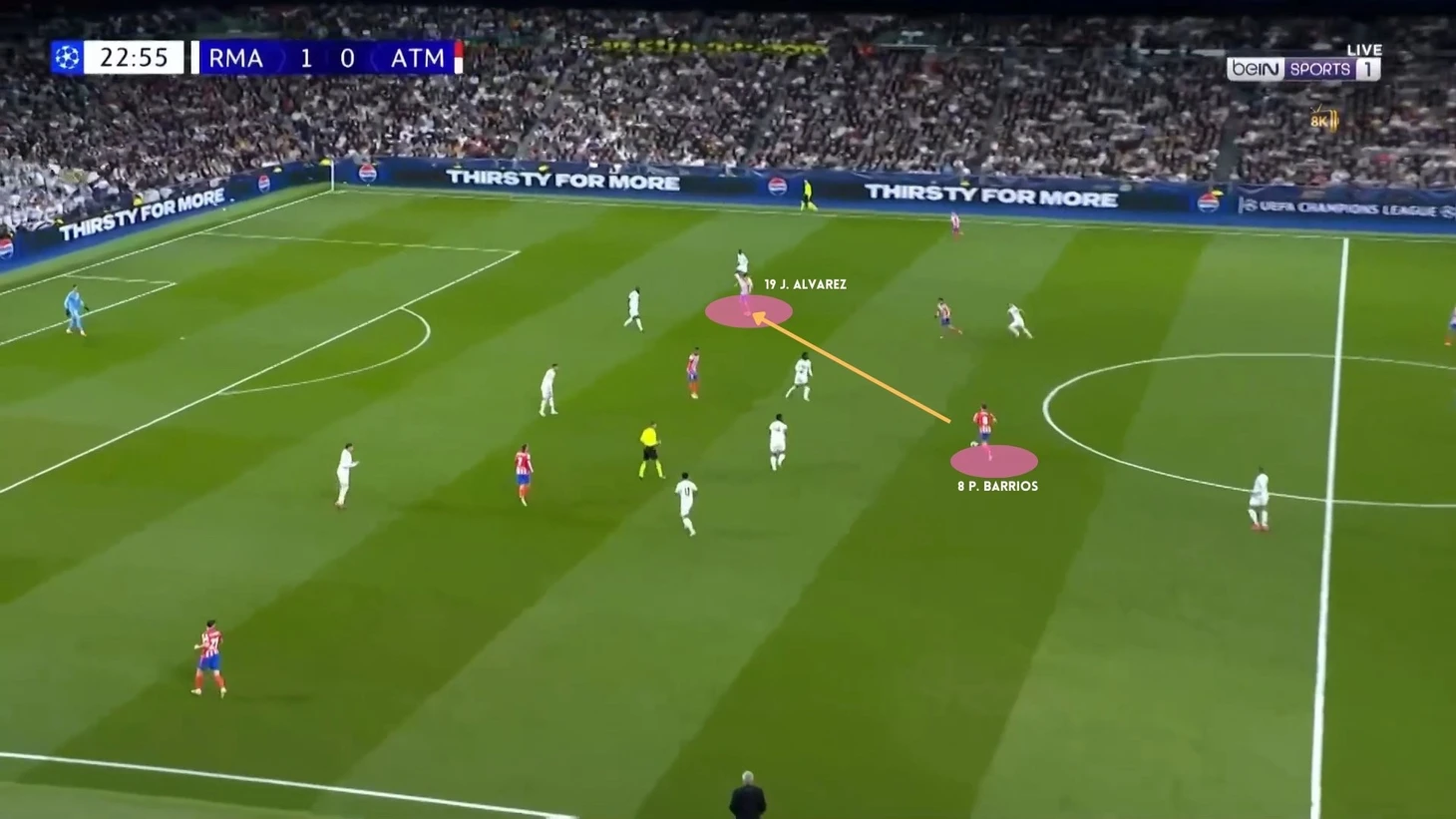После этого Барриос разгоняет атаку, а полузащитники и защитники «Реала» вынуждены встречать ее в полупозициях и с разрывами между линиями, которыми охотно пользуется Альварес, понимая, что Рюдигер не рискнет выдвинуться за ним в подобной ситуации.
