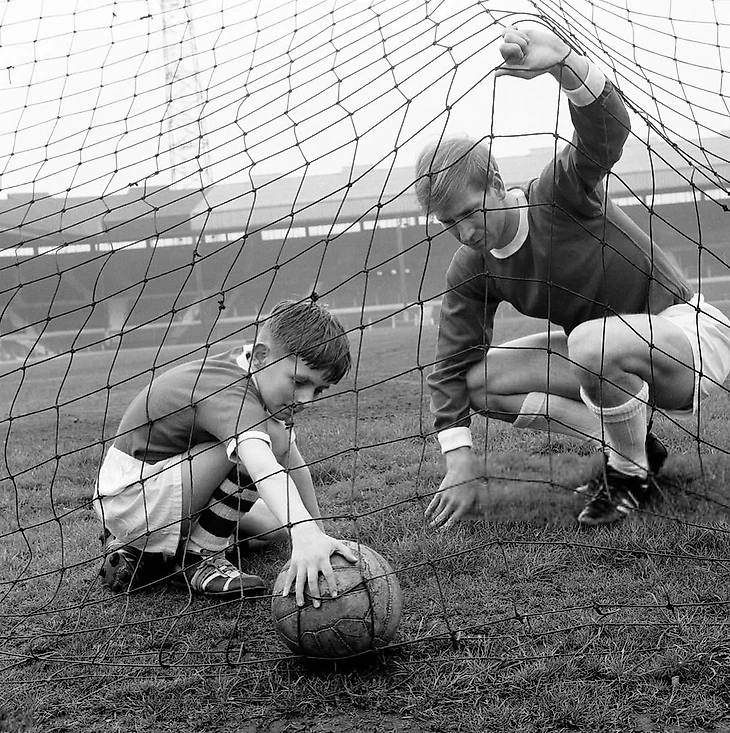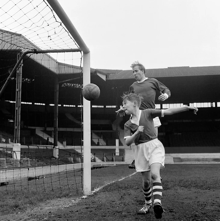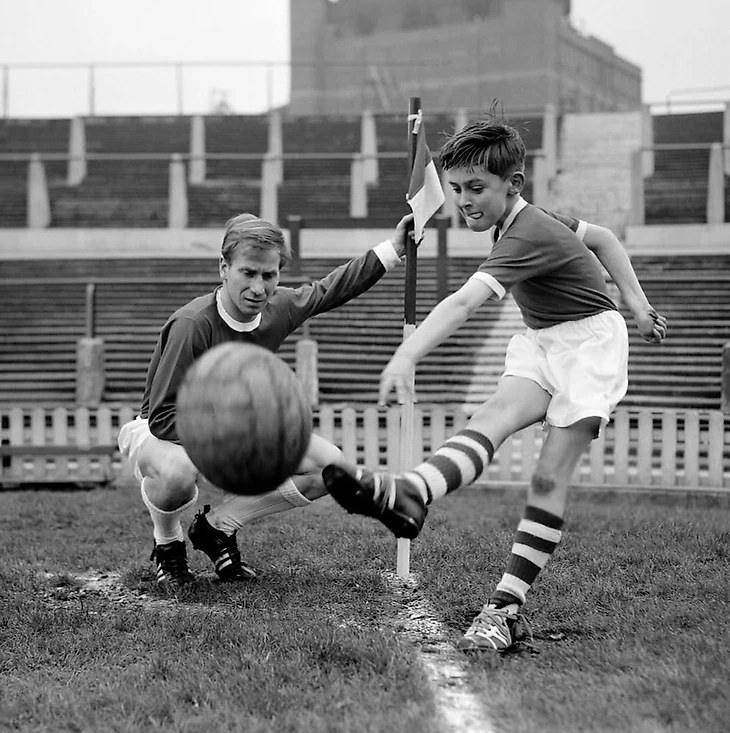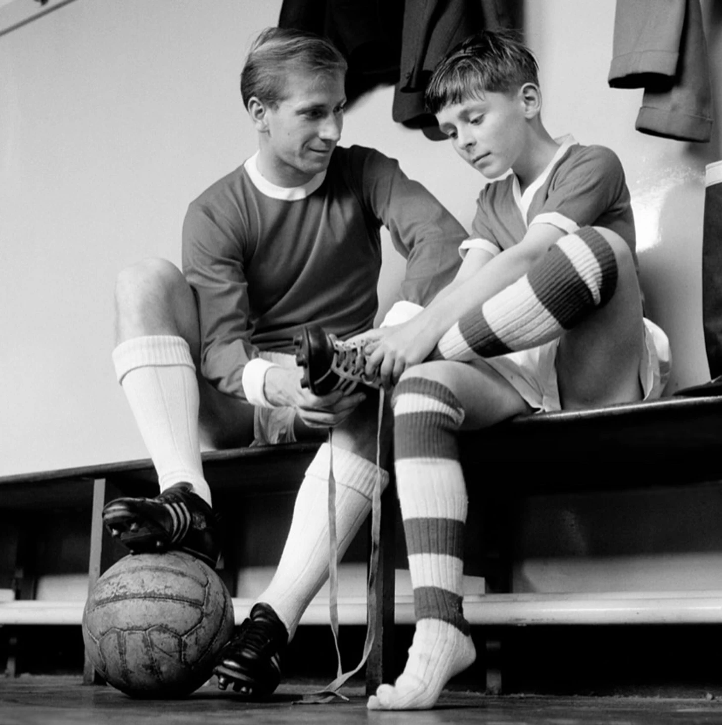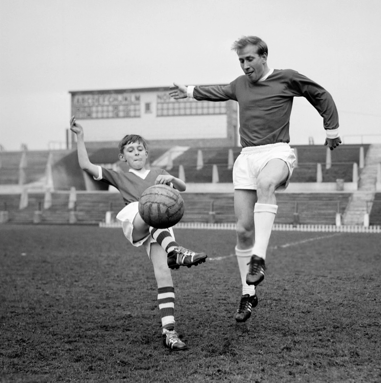 Апрель 1961 года, «Олд Траффорд». На фотографии запечатлен легендарный сэр Бобби Чарльтон, излучающий тепло и дружелюбие. Рядом с ним стоит юный мальчик, 11-летний Чарльз Адамсон из города Галифакс. Этот трогательный момент был запечатлен в специальном выпуске FA Book for Boys, популярного издания для юных футбольных фанатов.