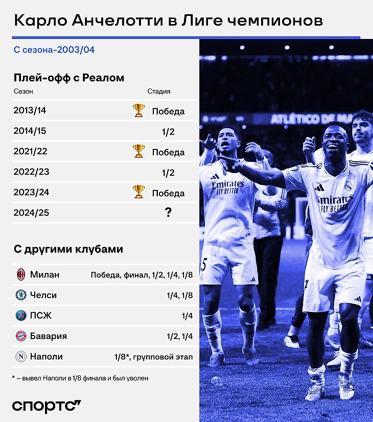 Анчелотти проводит шестой сезон с «Реалом» в плей-офф ЛЧ. В предыдущих пяти – три победы и два полуфинала. Считаем с сезона-2003/04, когда в ЛЧ появилась стадия 1/8 финала после группового этапа.