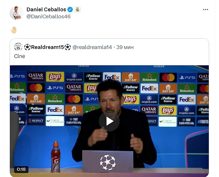 Полузащитник «Реала» Дани Себальос быстро увидел этот ролик в твиттере и отреагировал одним эмодзи – с поднятой рукой.