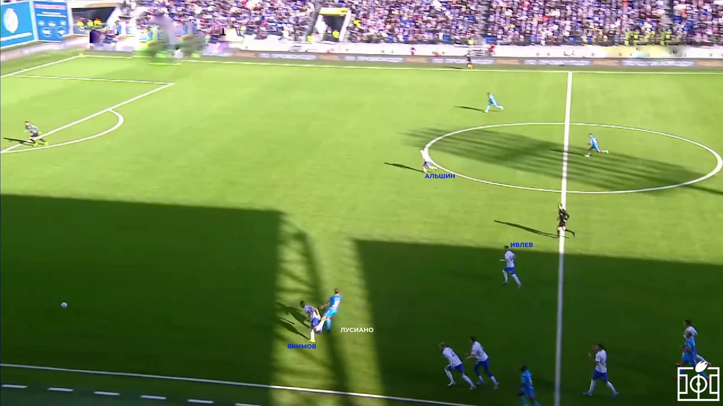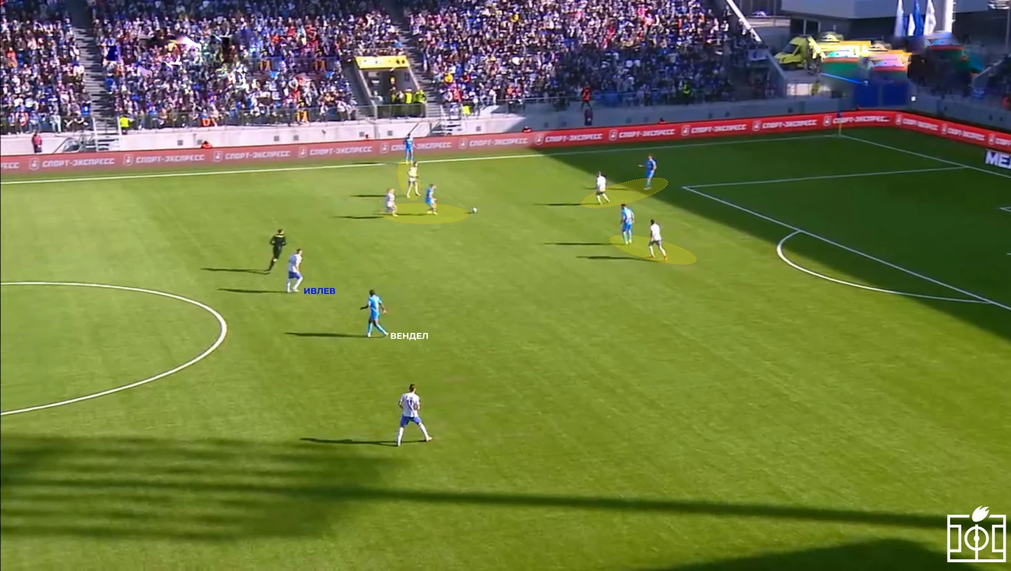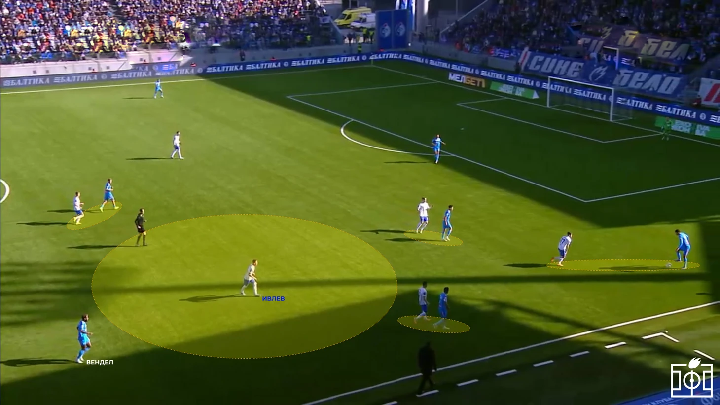 В предматчевом комментарии Дмитрий Анатольевич Пятибратов обозначил желание играть высоко и агрессивно с первых минут. Однако до пропущенного мяча игроки «Факела» скорее оборонялись средним блоком, лишь эпизодически включаясь в высокий прессинг при попытках игроков «Зенита» начать позиционные атаки через крайних защитников. При этом стоит отметить положение Ивлева в командном прессинге (см. скриншоты) — в обоих случаях полузащитник скорее страхует зону, что позволяет Венделу свободно перемещаться в поисках передачи.
