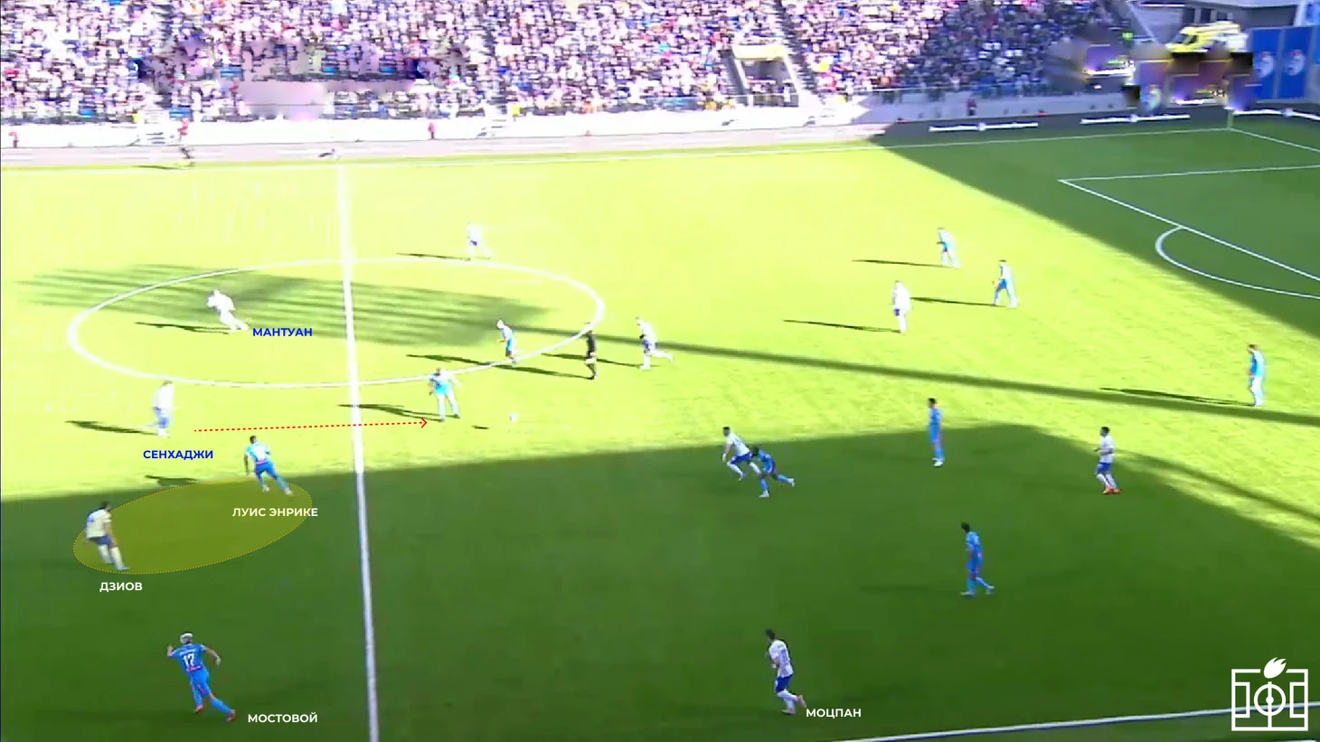 Выход быстрого Райана Сенхаджи на роль страхующего защитника выглядел логично — его скорость могла помочь нейтрализовать атакующую группу «Зенита» при игре с высокой линией. Однако по ходу матча Сенхаджи часто покидал центральную зону, уходя в подстраховку, прессинг или даже подключаясь к атакам на правом фланге. Это нарушало целостность обороны и открывало свободные зоны для соперника.