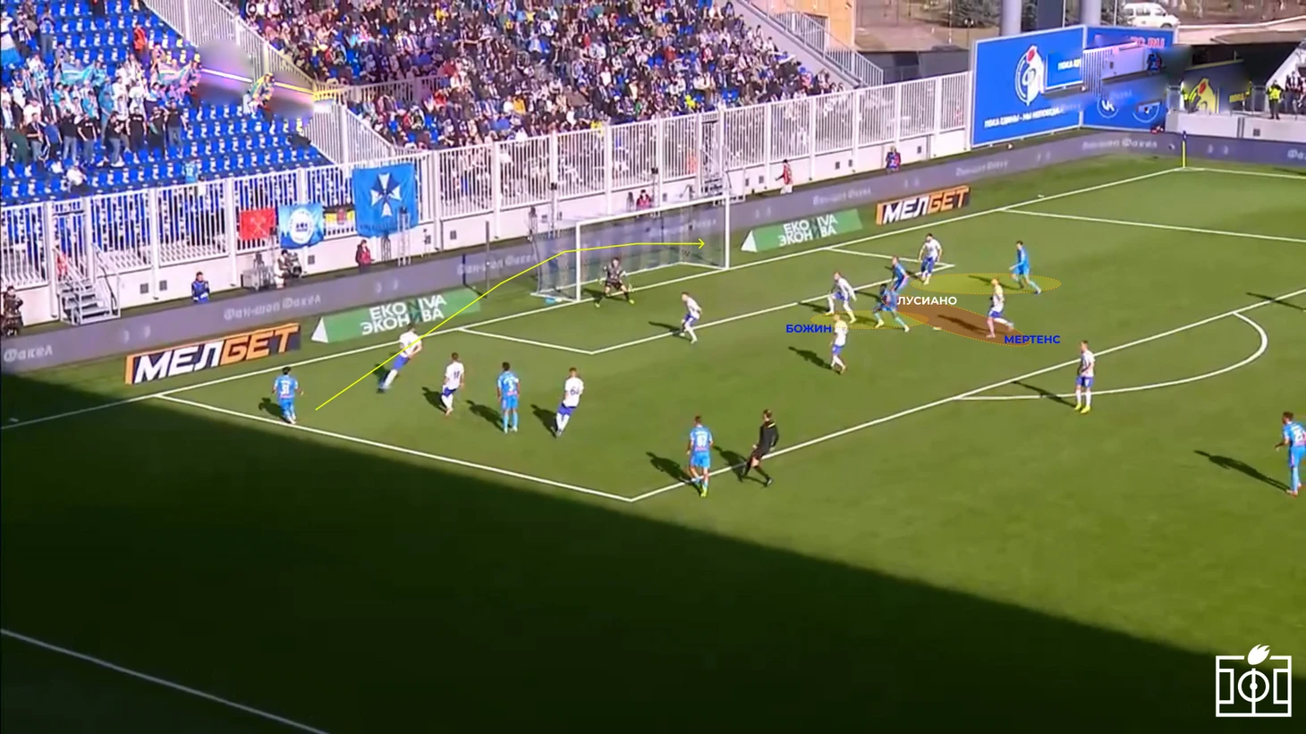 В момент передачи, выполненной Мантуаном, оказавшимся на левом фланге после подачи углового, Сергей Божин оказался в сложной ситуации — он был вынужден держать сразу двух соперников, Луиса Энрике и Лусиано, во многом из-за Мертенса, оказавшегося в полупозиции. В результате Лусиано без особых проблем замкнул передачу, воспользовавшись пространством и отсутствием давления.