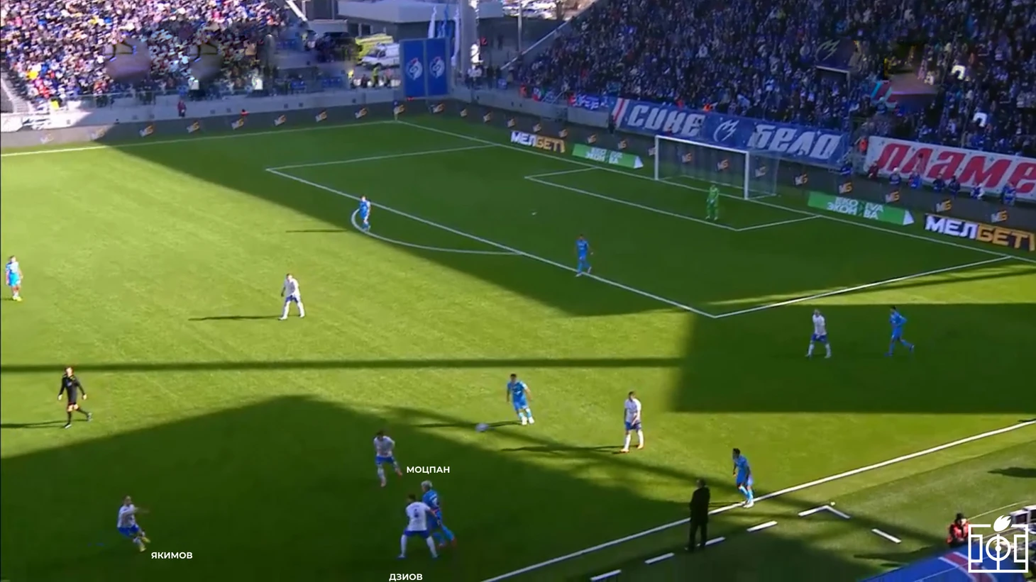 Дуглас Сантос довольно далеко выбросил мяч из-за боковой. Стоит отметить высокую позицию Макса Дзиова, плотно играющего с Андреем Мостовым