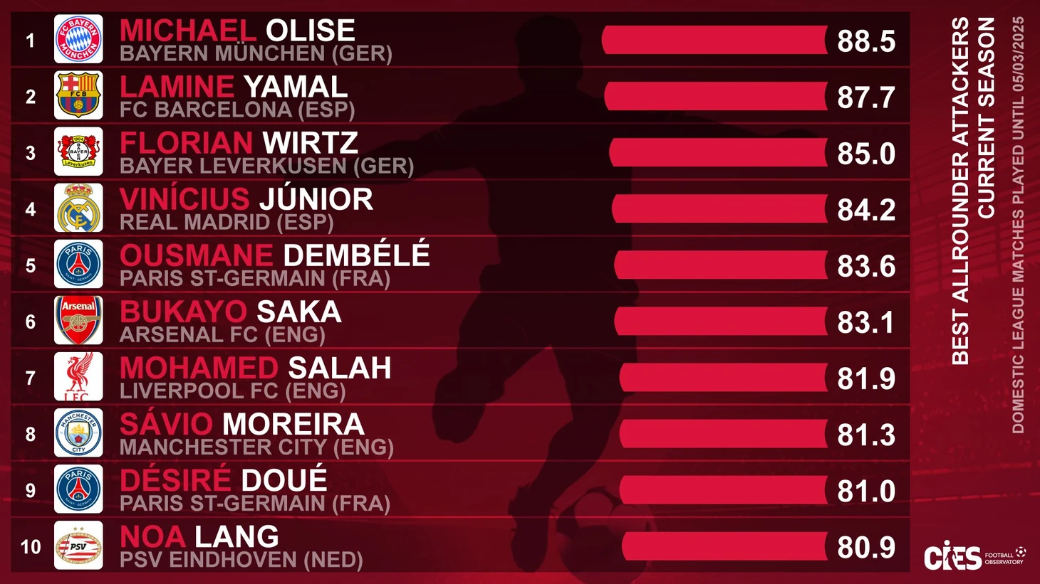 Эксперты составили топ, основываясь на статистике футболистов в трех ключевых областях атаки: обыгрыш, создание моментов и завершение. Исследование охватило выступление игроков в национальных чемпионатах в период с начала сезона до 5 марта 2025 года.
