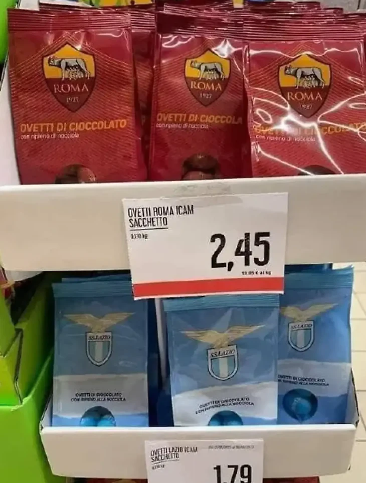 На полках магазина появились шоколадные яйца с символикой обоих клубов. Однако цена у «джаллоросси» оказалась выше, чем у «бьянкочелести» — 2,45 евро против 1,79.