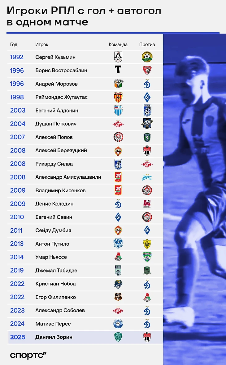 Возможно, вам кажется: гол и автогол у одного игрока за матч – огромная редкость. Нет, это не совсем так: только в истории РПЛ таких случаев минимум 22 с учетом Зорина – и вляпывались даже звезды.