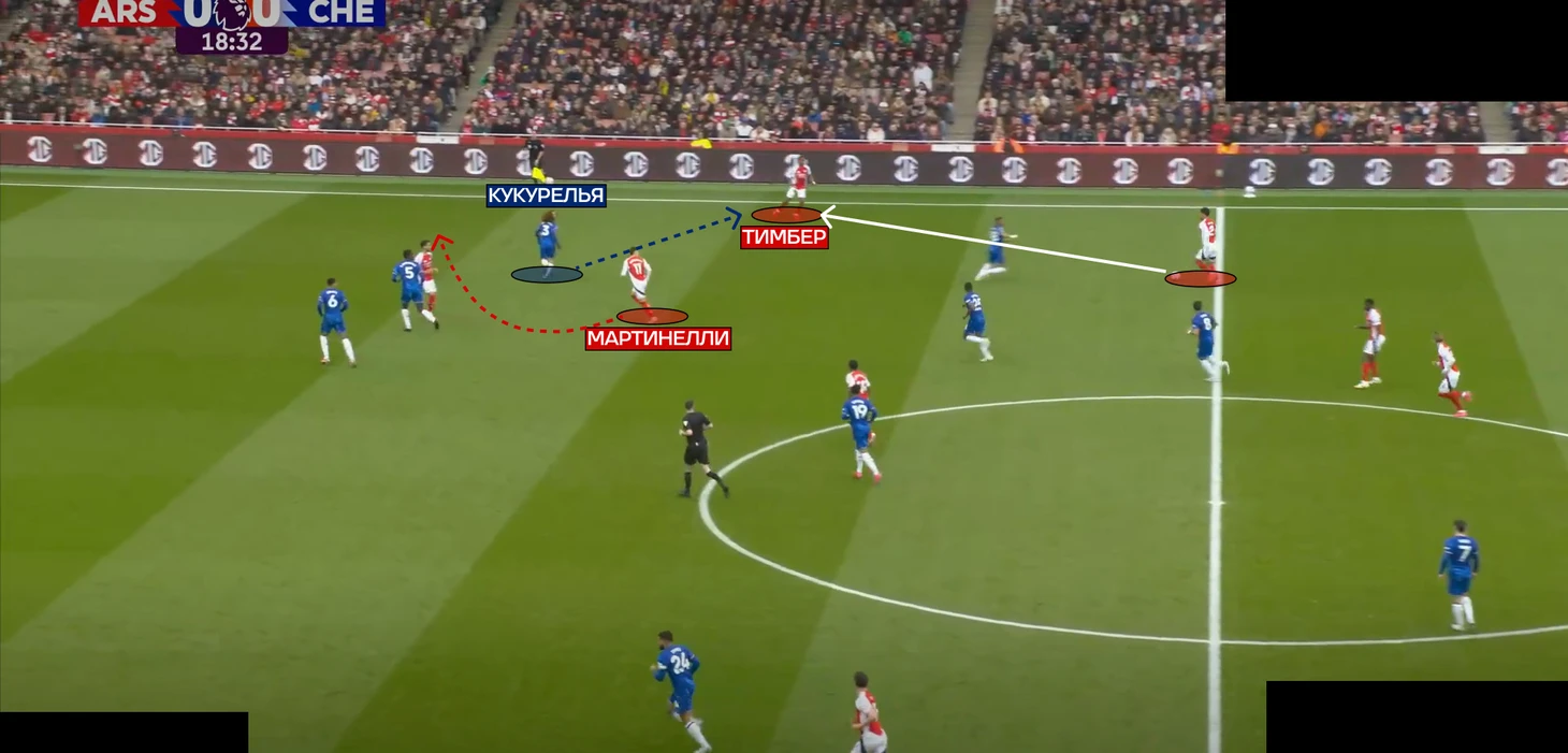 Абзацем ранее я писал о Тимбере. Голландец как раз занял эту зону между линией (грех туда не попасть, конечно), и при получении мяча на него выдернулся Кукурелья. Своим движением Марк открыл коридор, куда и ворвался Мартинелли. Против бразильца оказался Бадиашиль (ага…), которого Габриэль уделал в скорости.