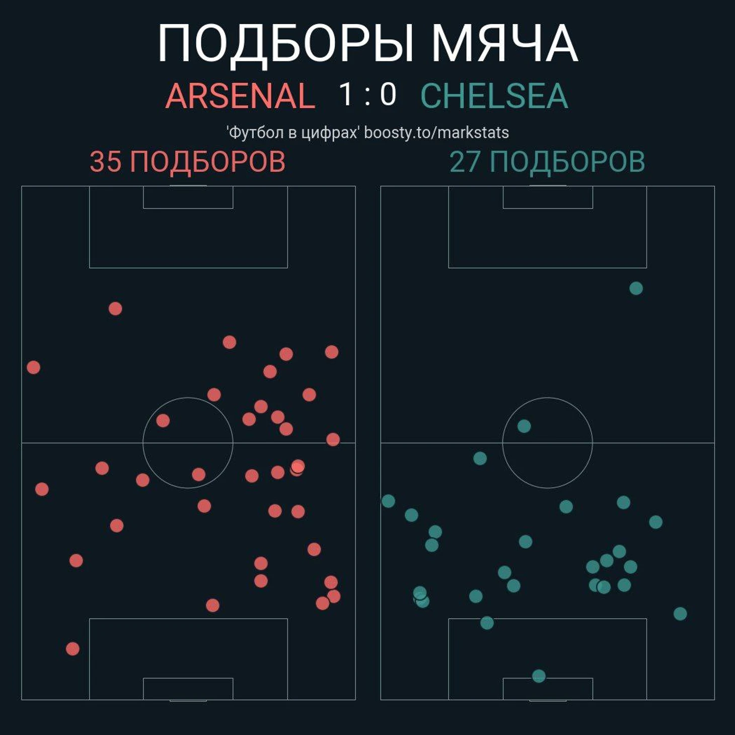 Как только мяч уходил к защите «синих» – «Арсенал» сразу активизировал прессинг. Активное давление на «Челси» во всех стадиях атаки подарило хозяевам 35 подборов мяча за весь матч – большая часть из которых пришлась в центре поля.