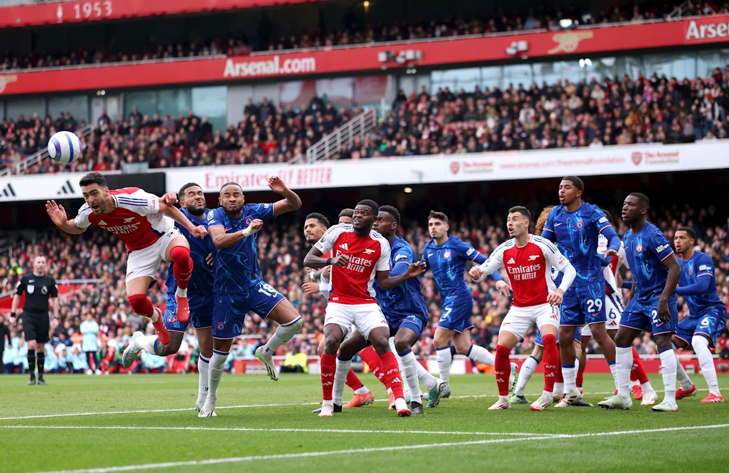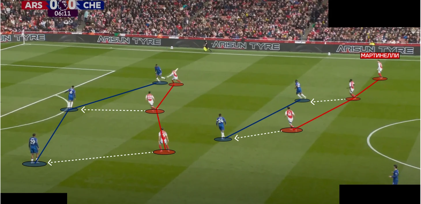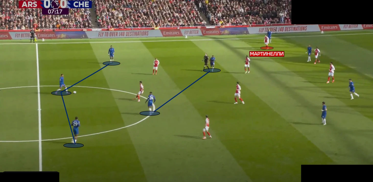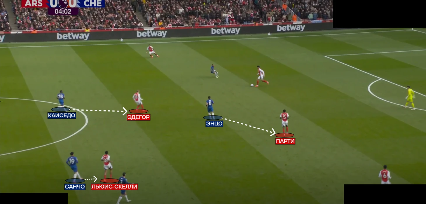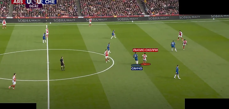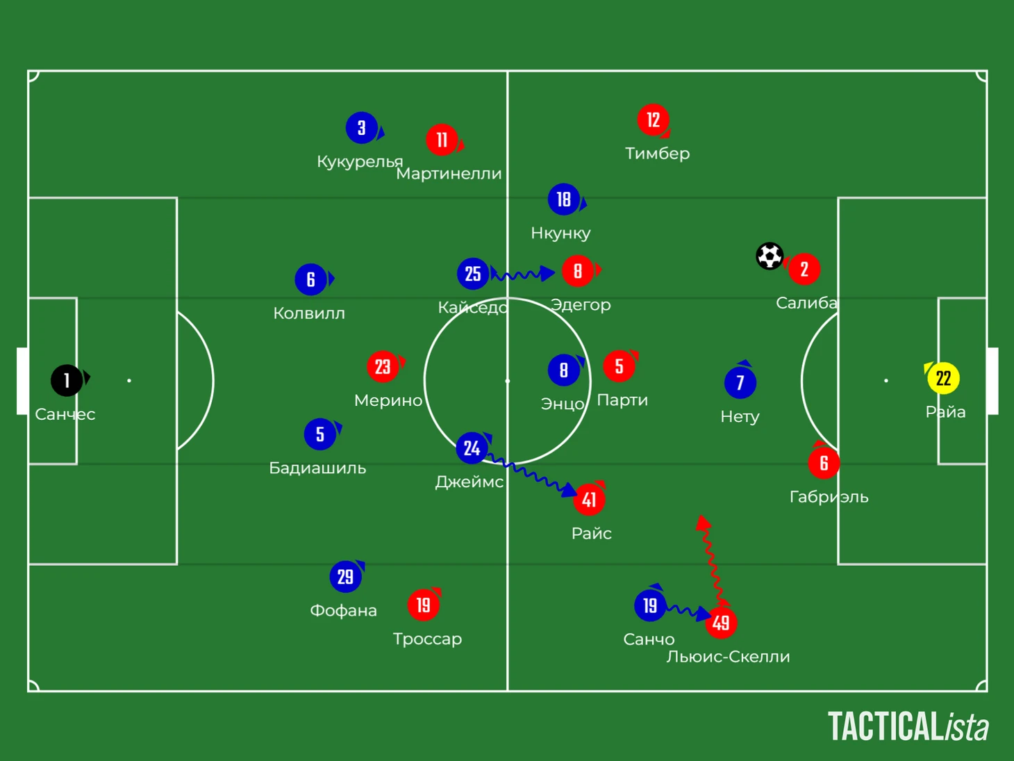 «Арсенал» начинал атаки через билдап «4+1», где единственным опорником был Парти. Против этого «Челси» выстроил защитную структуру «4-2-3-1», а Нкунку или Санчо периодически могли подниматься на одну линию с Нету, оказывая давление на защиту «канониров».