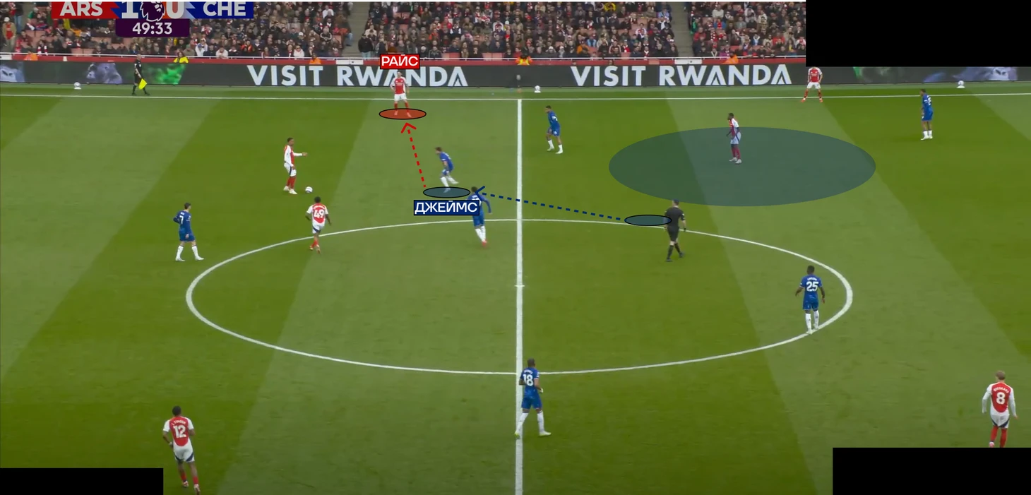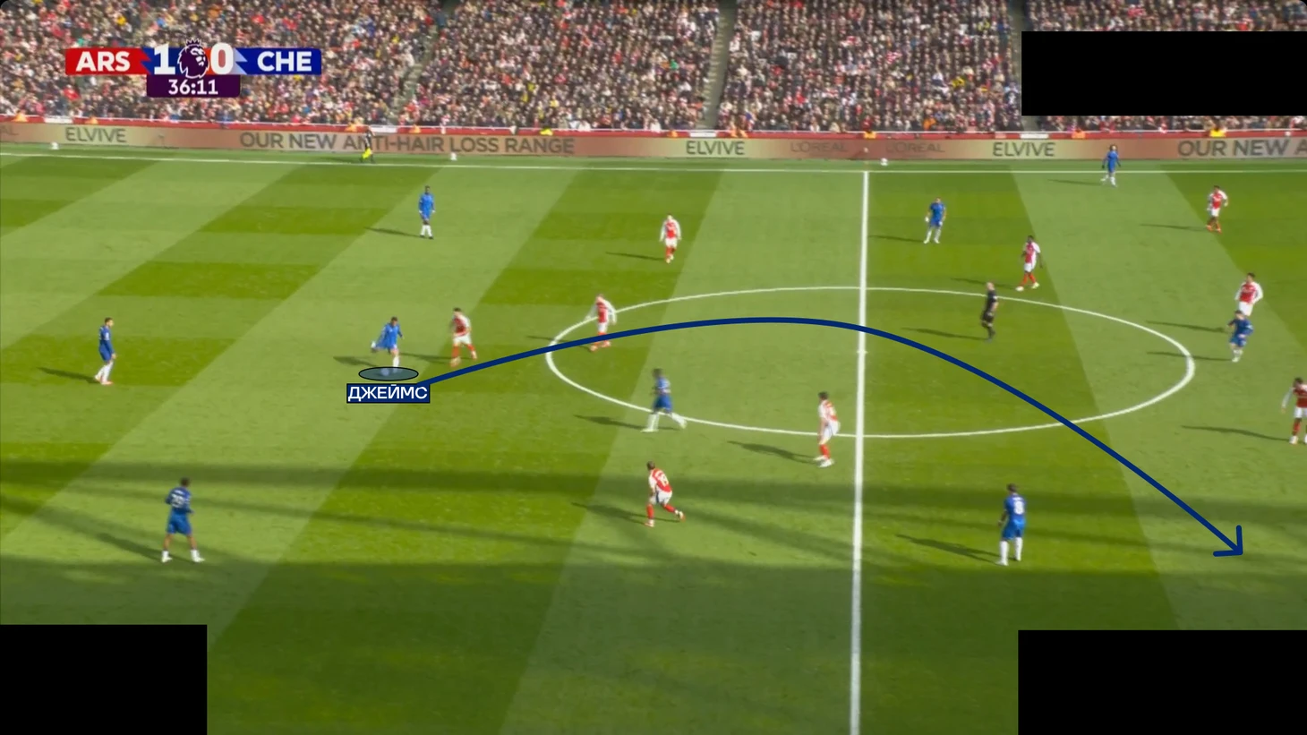 К слову, хочу выделить движение Райса – англичанин также опустился ниже, выдернув за собой Джеймса. В итоге, в защите «синих» создался гигантский разрыв, чем и пользовался «Арсенал».