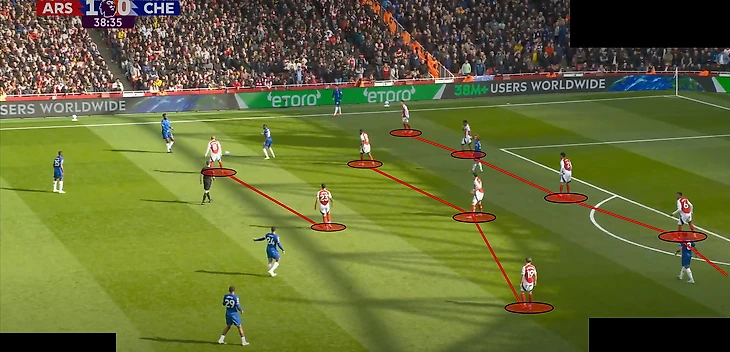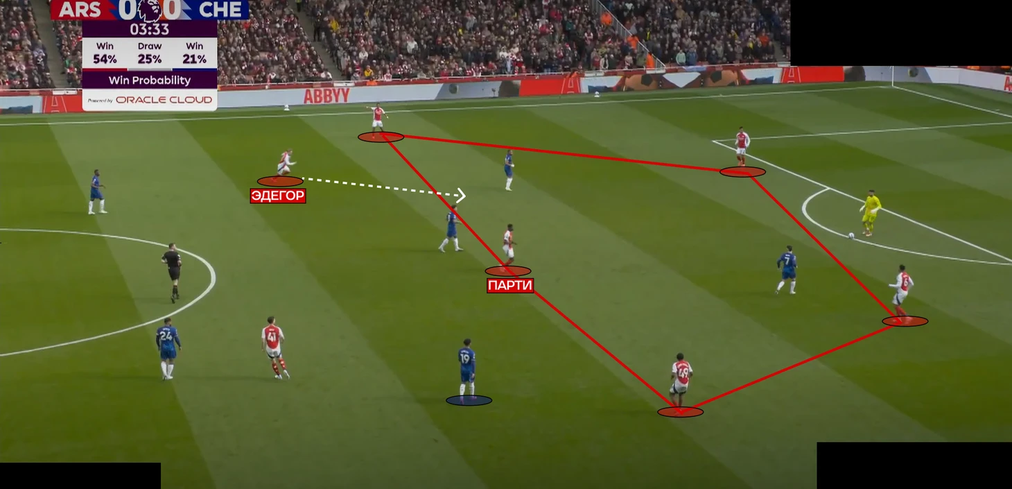 «Арсенал» забил гол благодаря смещению в опорную зону. В начале атаки, к Парти опускался Эдегор, а Кайседо (который привязан к норвежцу) выдергивался из опорки, занимая место в первой линии «Челси». Позиция Мартина позволила Тимберу пойти выше – такой ход аукнется дальше.