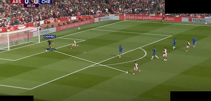 «Челси» довольно предсказуемый. Базовые «3-2-5» в атаке, без инвертированных фуллбеков (Джеймс играл опорника во всех стадиях матча). На этот ход «Арсенал» отреагировал активным прессингом на защитную тройку с помощью Эдегора, Мерино и Троссара.