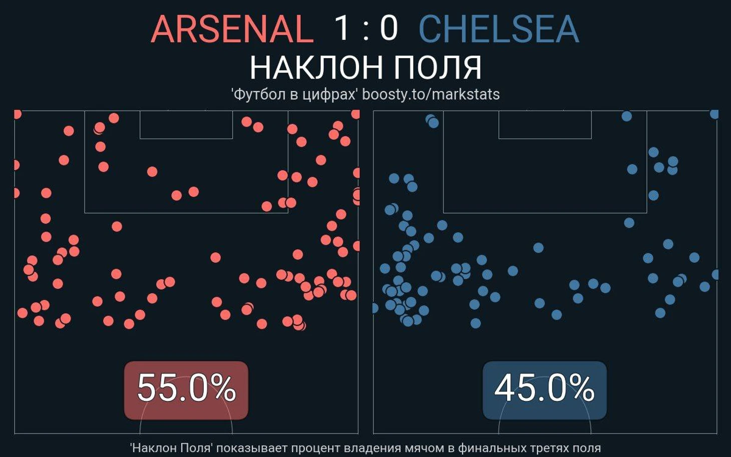 Вся боль позиционной атаки «Челси» кроется в графике «Наклон поля», который показывает не только процент владения мячом в финальных третях, но и касания мяча. Посчитайте сами, сколько раз «синие» его коснулись.