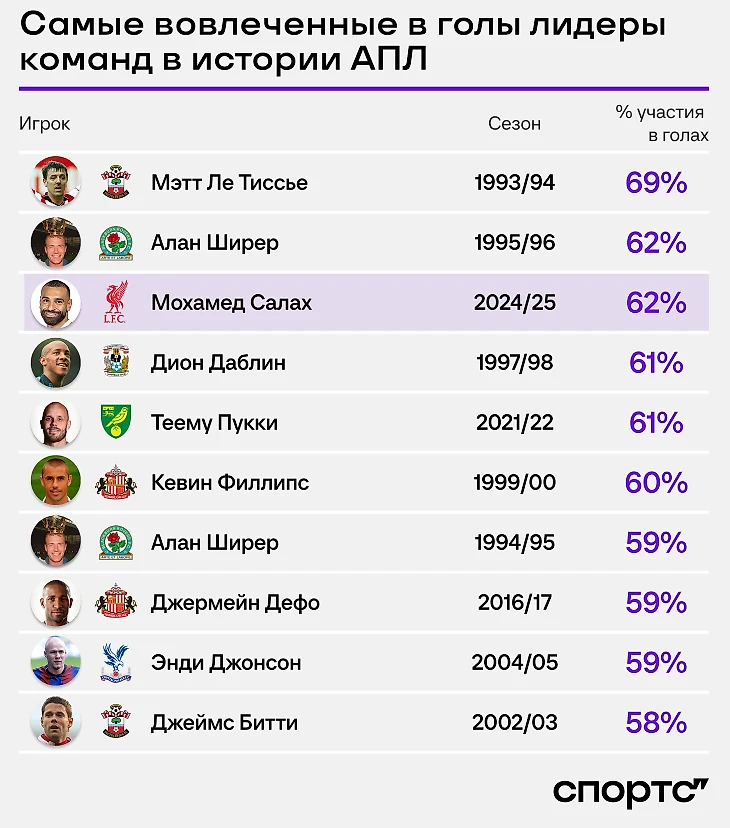 В тот момент 62% голов «Ливерпуля» случились при прямом участии Салаха (либо сам забивал, либо ассистировал). С тех пор доля Мо даже подросла – теперь 63%. В эпоху АПЛ еще больше было только у Мэтта Ле Тиссье в «Саутгемптоне». Важное отличие – Ле Тиссье выдавал подобное в команде, которая боролась за выживание. Это частая и даже естественная история. Даже в этом сезоне АПЛ есть примеры, когда слабая команда сознательно делает ставку на самого талантливого игрока (Матеус Кунья в «Вулвз» и Лиэм Делап в «Ипсвиче»). Для топ-клуба подобная зависимость – редкость. Вроде Алана Ширера в чемпионском «Блэкберне».