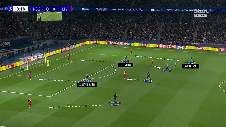 Структура давления была похожей вплоть до деталей. В первой волне вингер+нападающий: у «ПСЖ» – Дембеле и Хвича, у «Ньюкасла» – Барнс и Исак. Чтобы подстроиться под схему «Ливерпуля» и составить следующую волну персоналок, выше выдвигался один из латералей: у «ПСЖ» – Хакими; у «Ньюкасла» – Ливраменто: