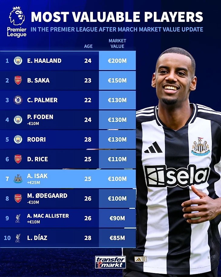 🤑 Transfermarkt обновил стоимость игроков АПЛ. Исак вошел в элитную компанию, звезды грандов провалились