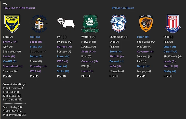 На что по-прежнему можно опираться в турнирном плане? Ну, я исхожу из того, что помимо «Оксфорда» еще 7 клубов до сих пор не преодолели рубеж в 43 очка. Есть например «Плимут» и «Лутон», которые в зоне вылета вязнут довольно сильно, набрав 33 и 35 соответственно, и им потребуется внезапный рывок в стиле трех подряд побед «Дерби», который при этом все равно пока остался 22-м. Некоторые уверены, что для выживания «Оксфорду» окажется достаточно еще трех побед, но сложно понять, откуда они возьмутся, если в календаре еще остаются матчи против «Лидса», «Шеффилд Юнайтед» и «Сандерленда», находящихся в лидирующей группе. Очень не хотелось бы доводить до той ситуации, когда в последнем туре «Оксфорд» поедет в гости к «Суонси», и лишь победа будет оставлять шансы на сохранение прописки в Чемпионшипе.