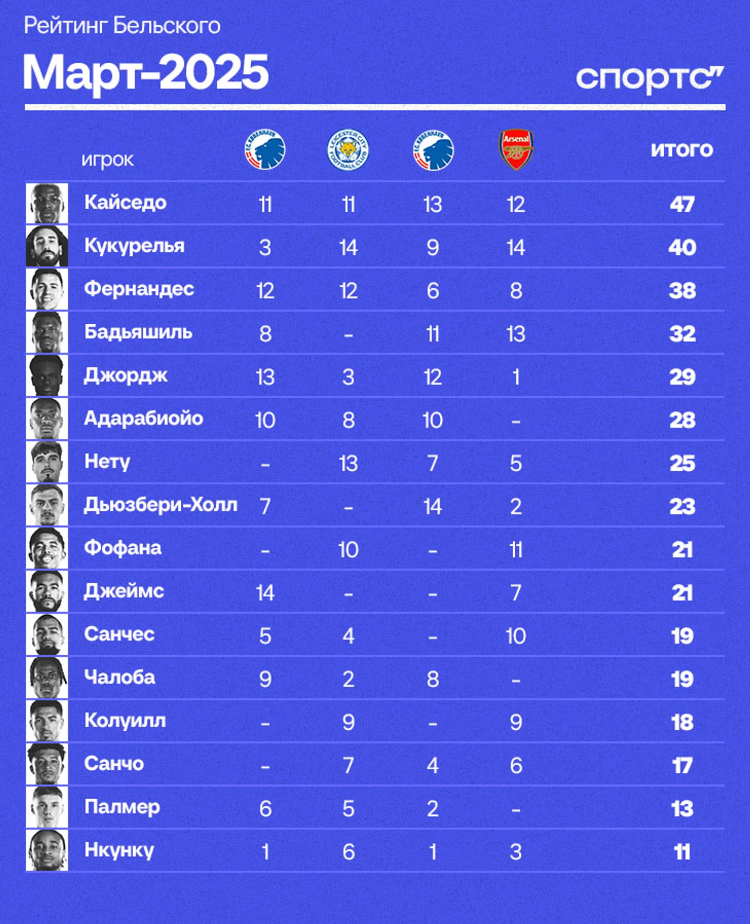 В лидерах все те же: Кайседо и Кукурелья снова лучше всех, Энцо третий, а вот на втором месте на удивление оказался Бенуа Бадьяшиль. Француз и правда был хорош в матчах Лиги конференций и оказался самым надежным защитником в дерби против «Арсенала».