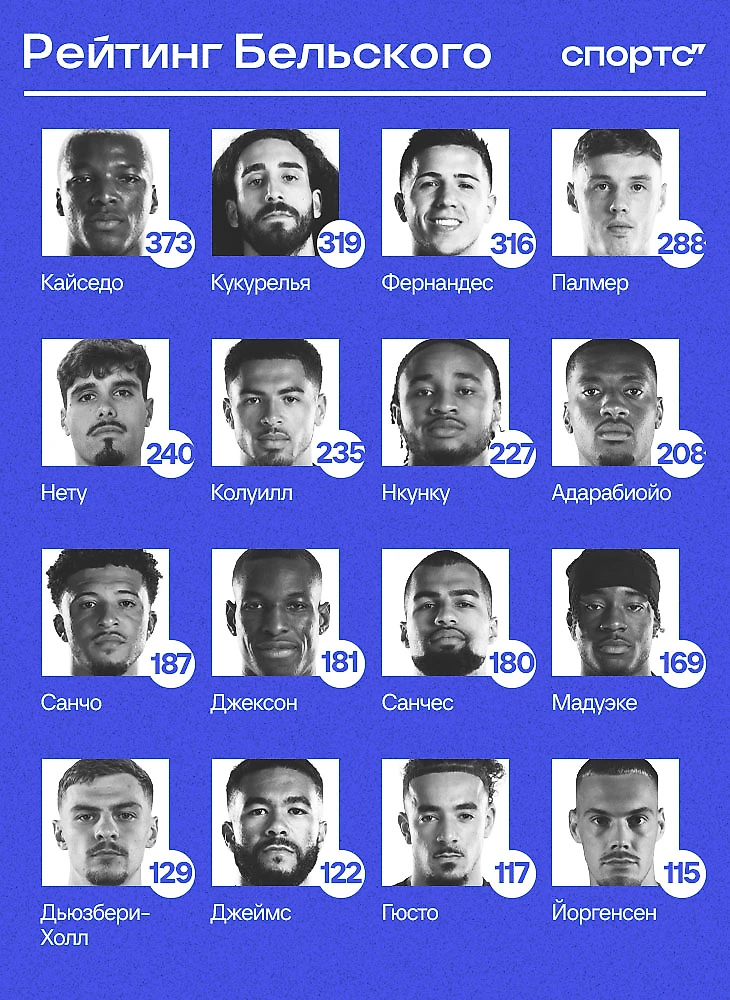 Особенно грустная последняя тройка: Санчо, Палмер и Нкунку втроем набрали меньше Кайседо. Атакующая импотенция.