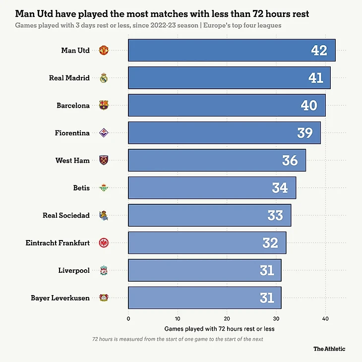 Но справедливы ли претензии Карло Анчелотти? В этом разобрался The Athletic. Оказалось, что начиная с сезона-2022/23 в топ-4 лигах Европы больше всего матчей на третий день и менее провел «Манчестер Юнайтед» − 42. На втором месте «Мадрид» − 41, а на третьем − «Барселона» с 40.