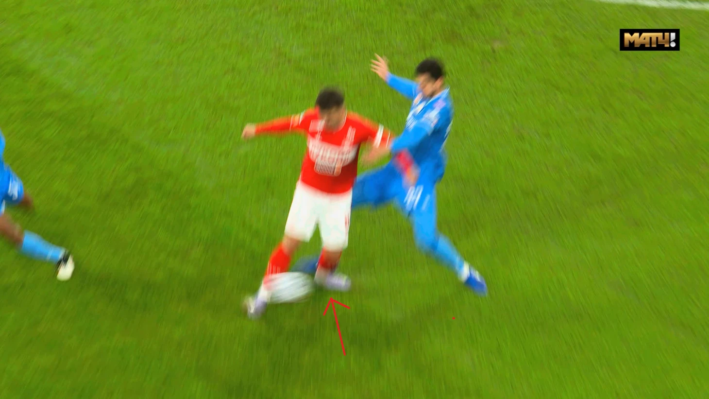 Ну и последний эпизод с не менее очевидной, но уже не такой забавной ошибкой, произошел в битве «Спартака» и «Зенита». На 26-й минуте был не зафиксирован фол вблизи штрафной «Зенита» и не показана желтая карточка за грубую игру. Момент получился жестким: Угальде получил мяч и пытался с ним продвинуться, но сзади его подкараулил Нино и на большой скорости шипами влетел в голеностоп нападающему, тот сильно изогнулся, что видно на следующем скриншоте.