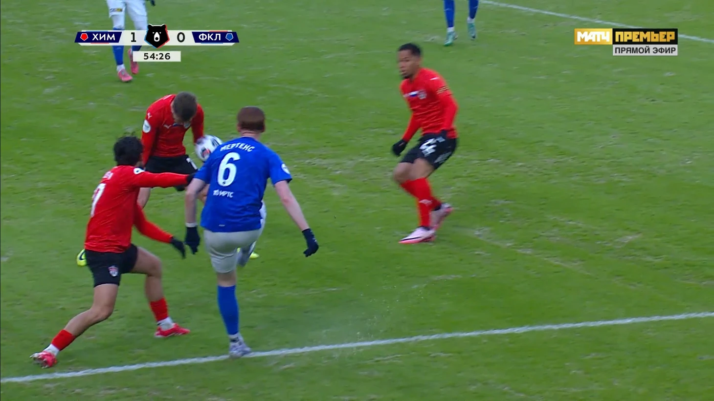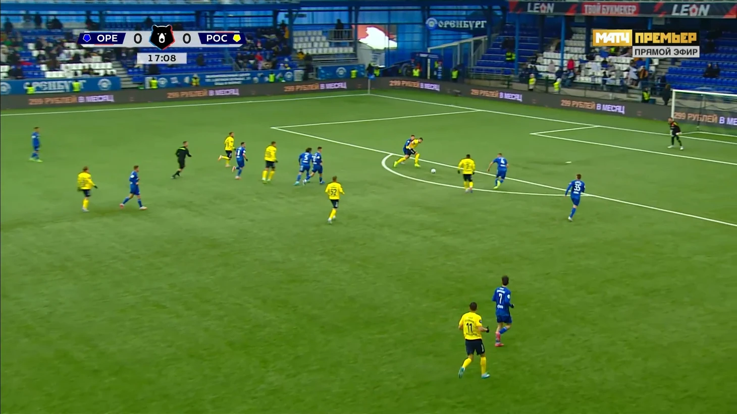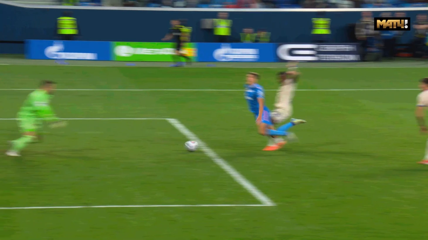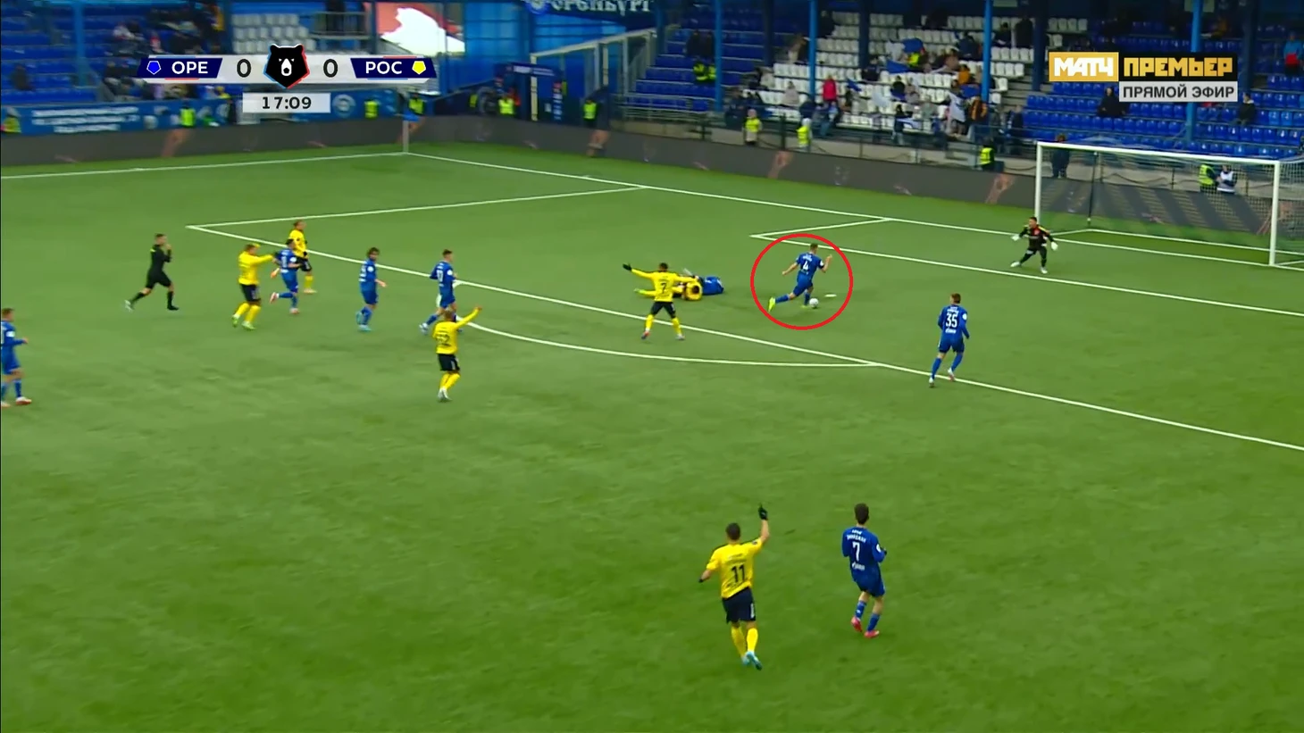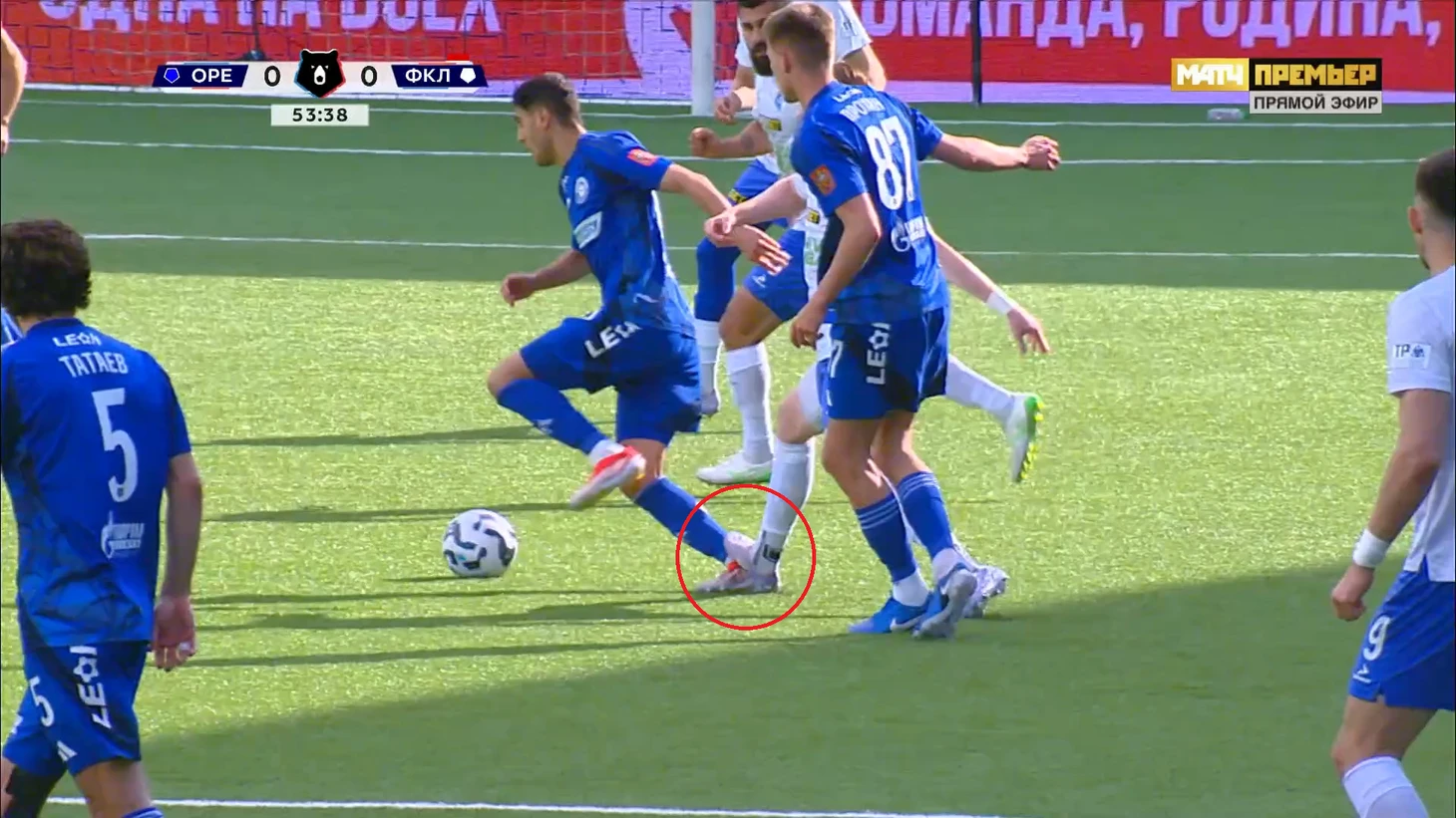 Но эту иллюзию развеивает следующий стоп-кадр. Оказалось, что мяч катился слишком сильно и гораздо ближе к нему по итогу располагался защитник «Оренбурга». Проще говоря, эпизод в динамике всего помогает лучше понять, что случилось.