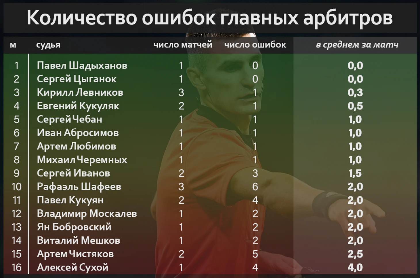 Напоследок хотелось бы подсветить наших арбитров и их непростую работу. Из опытных лучше всех сработал Кирилл Левников, который отработал главным на поле все три тура и допустил лишь одну ошибку. Отметим и Шадыханова с Цыганком, все-таки единственные, кто не ошибся ни разу. А вот Алексей Сухой оказался худшим, хотя в целом далеко не самый слабый арбитр.