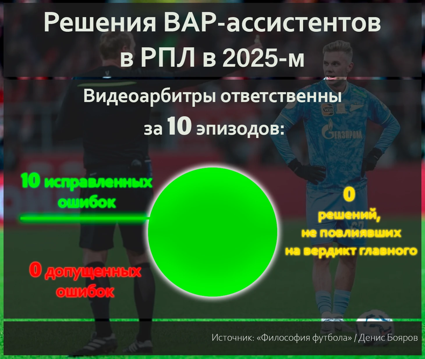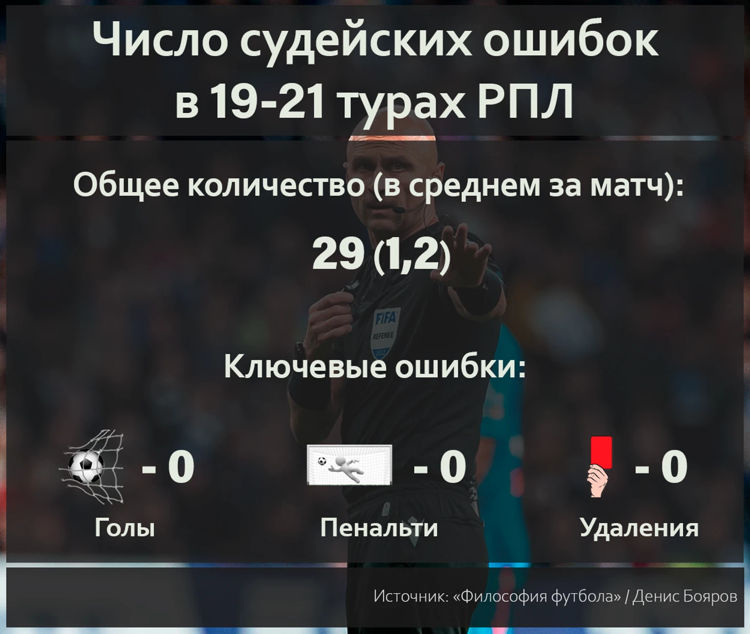 В общем вы поняли: ошибки случаются всегда и не стоит идеализировать. Тем более, за главными арбитрами еще подчищают ВАР-ассистенты, которые в начале весны не позволили состояться многим ключевым ошибкам. Как раз благодаря ним у нас пока 0 ошибок, связанных с голами, пенальти и удалениями.