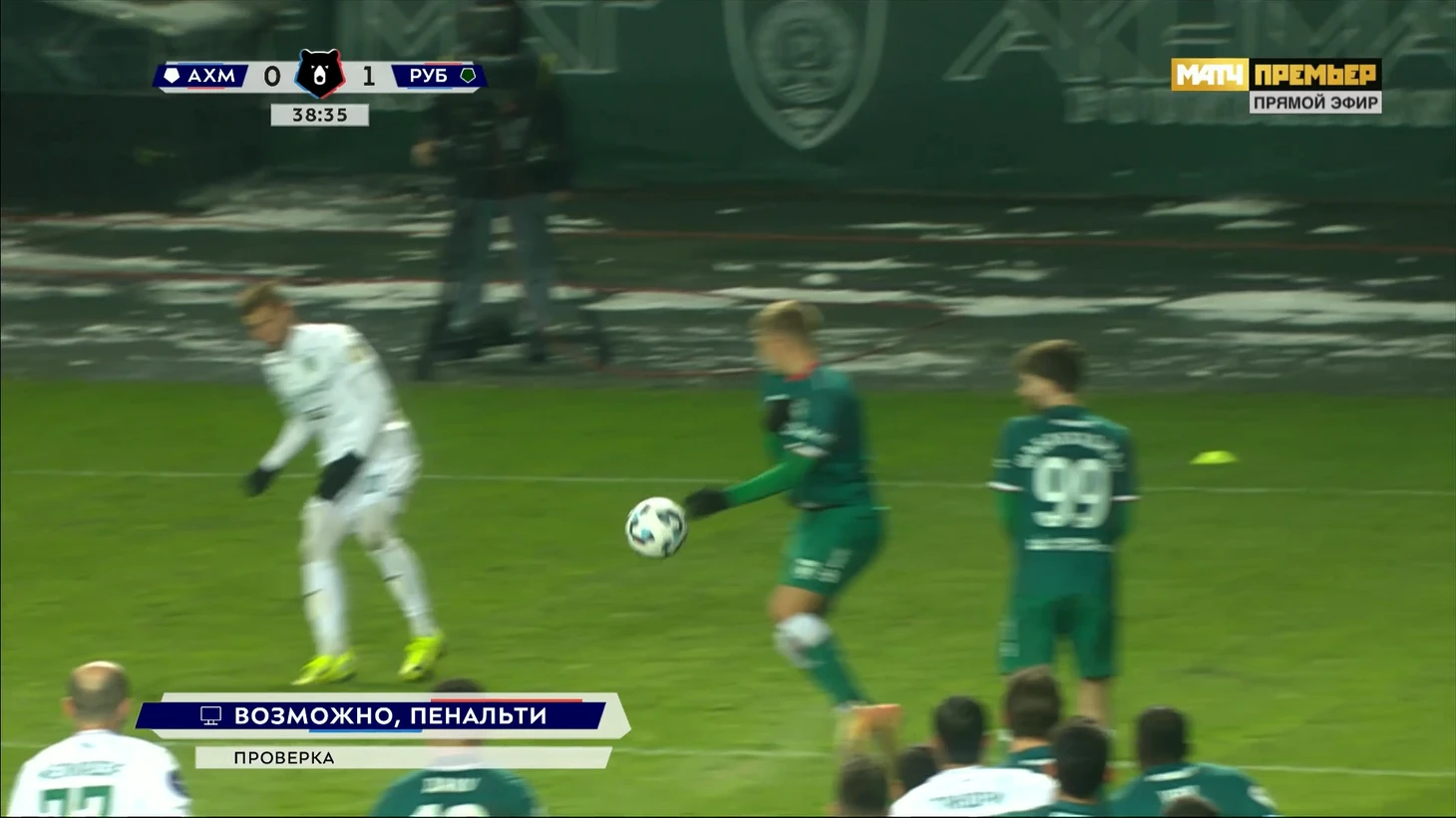 В матче «Ахмата» с «Рубином» главный судья пропустил попадание мяча в выставленную руку игроку «Рубина». Эпизод в таких случаях оценивается по двум критериям: было ли движение к мячу и насколько рука отставлена. Во втором критерии важно, чтобы рука располагалась не больше, чем 7 часов относительно корпуса тела, такая вот своеобразная рекомендация. В нашем примере оба пункта в пользу пенальти, и ВАР вмешался в эпизод, исправив ошибку судьи в поле.