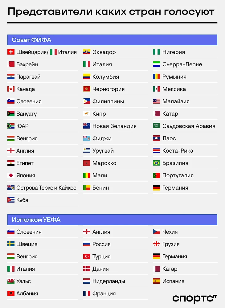 В ФИФА для решения нужно большинство голосов президиума совета, куда входят 7 человек: президент и главы шести конфедераций. А затем еще ратификация 37 членами самого совета – тоже большинством присутствующих.