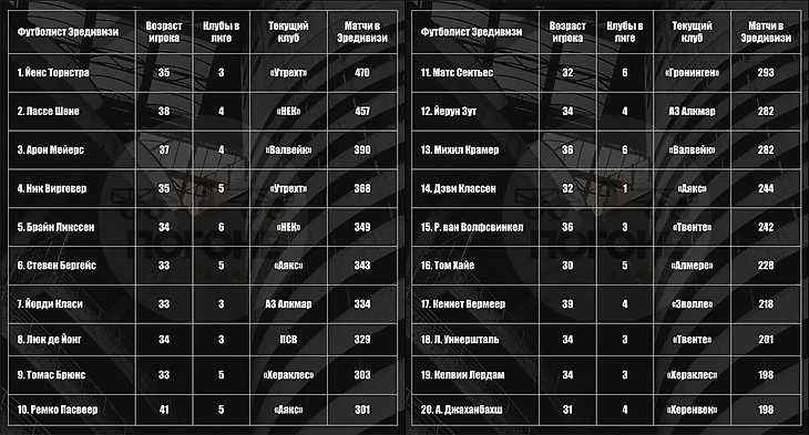 Продолжаем в Нидерландах. Ниже представлены лидеры среди действующих игроков Эредивизи по количеству сыгранных матчей в чемпионате. В списке указаны их возраст, число клубов Эредивизи, за которые они выступали, а также нынешняя команда.