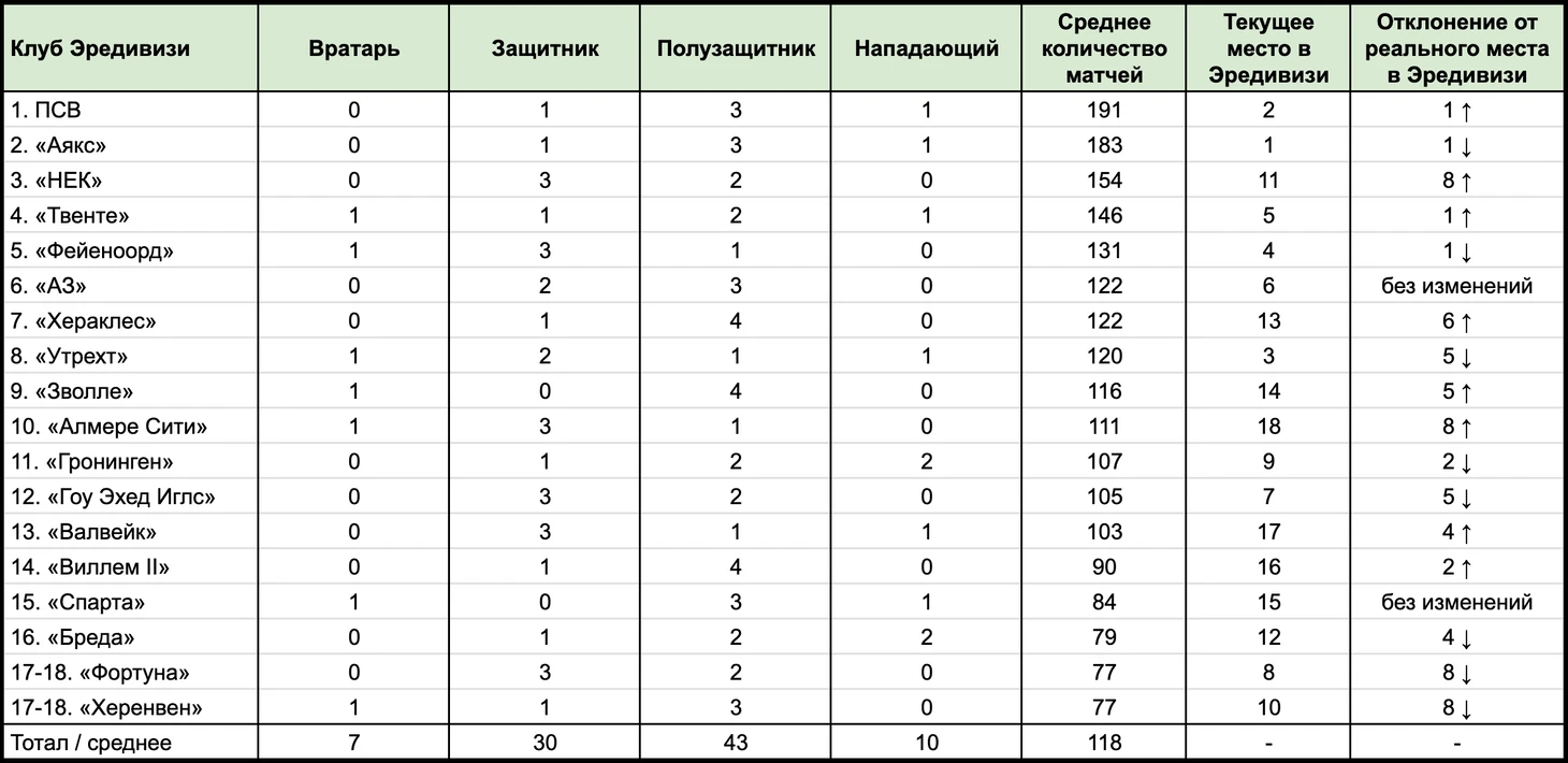 В среднем по 18 клубам Эредивизи вышло, что футболист проводит за клуб 118 матчей, то есть плюс/минус 3 сезона. Меньше, чем в АПЛ (224 матча), Ла Лиге (217 матчей), Бундеслиге (212 матчей), Серии А (155 матчей), РПЛ (145 матчей) и Лиге 1 (140 матчей).