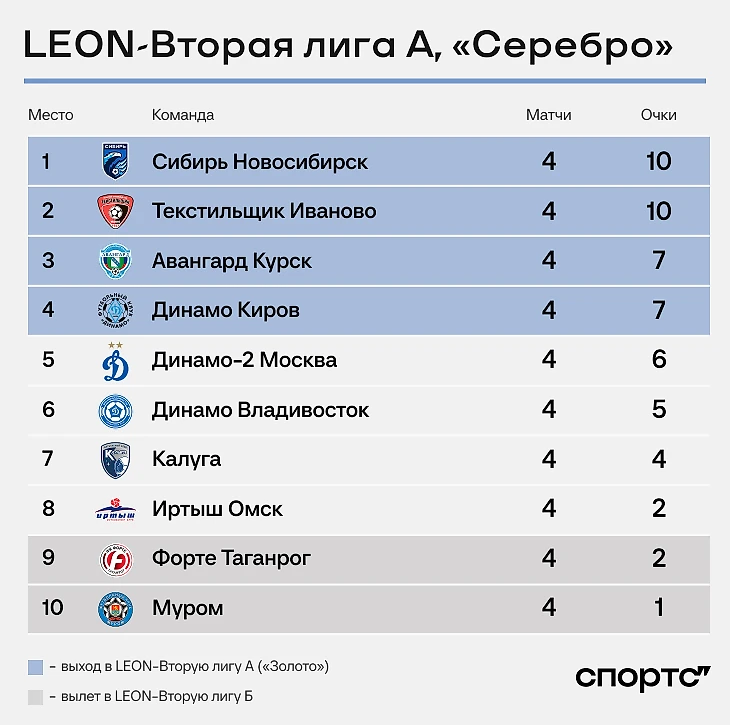 Спустились в «Серебро» по итогам осеннего этапа тоже четверо: «Авангард», «Сибирь», «Текстильщик» и «Калуга». Спойлер: почти все скоро могут вернуться.