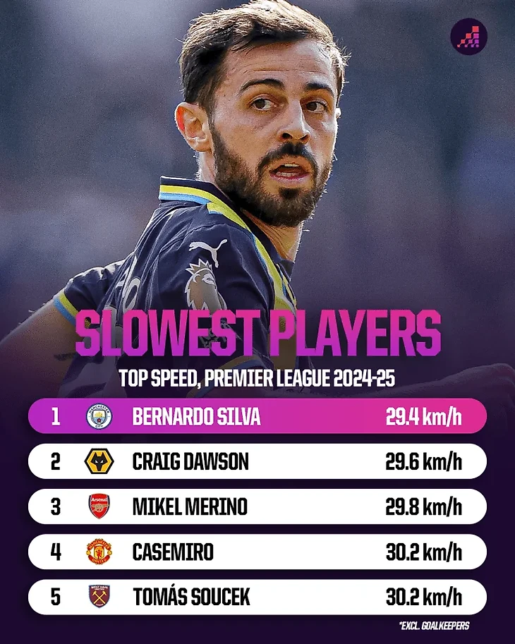 На этот раз Opta также дала данные по самым медленным спринтам в сезоне − в рейтинге не участвовали вратари. И здесь на первом месте довольно неожиданный игрок − вингер «Манчестер Сити» Бернарду Силва (29,4 км/ч). Похоже, что португалец стареет или просто экономит силы.