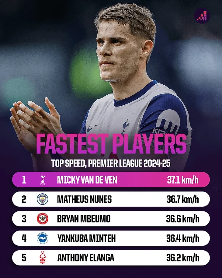 Второй год подряд лидерство удерживает центральный защитник «Тоттенхэма» Микки ван де Вен − 37,1 км/ч. Неизвестно, чем его кормят, но обогнать его решительно невозможно. Где-то рядом находятся Матеуш Нунеш из «Манчестер Сити» (36,7 км/ч) и Бриан Мбемо из «Брентфорда» (36,6 км/ч). Далее идут Янкуба Минте из «Брайтона» (36,4 км/ч) и Энтони Эланга из «Ноттингем Форест» (36,2 км/ч).