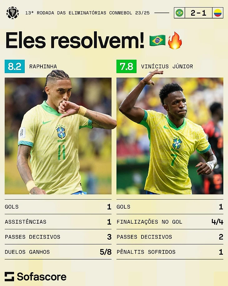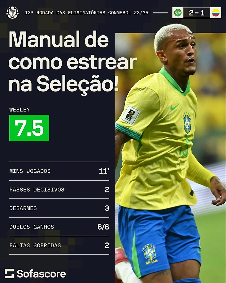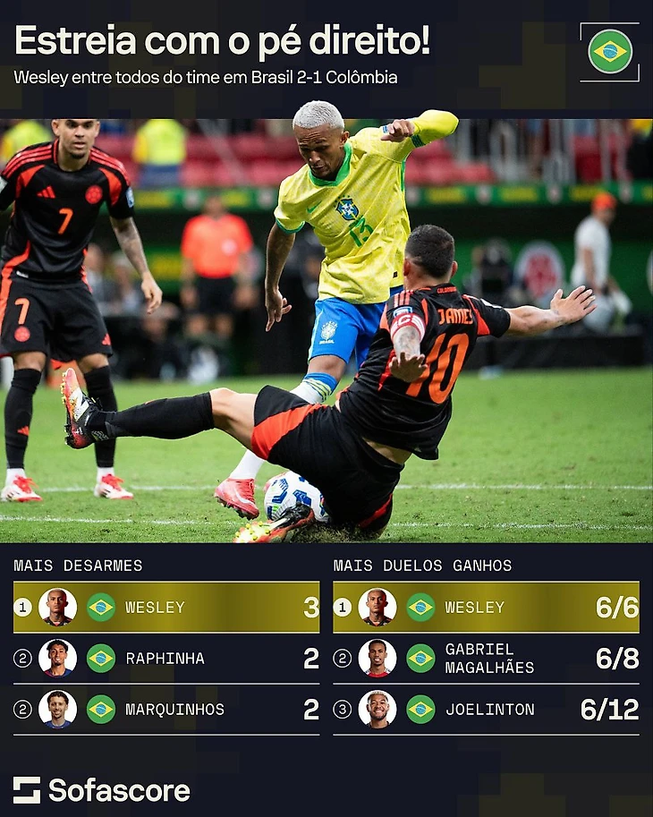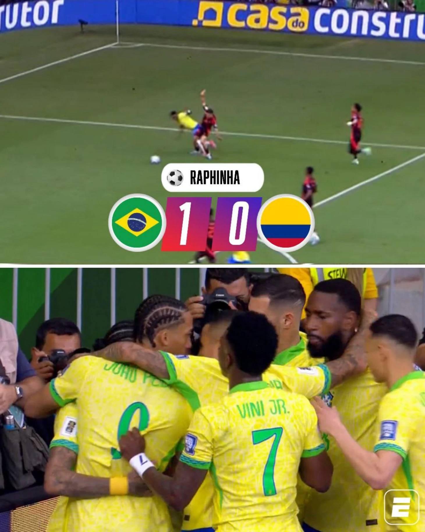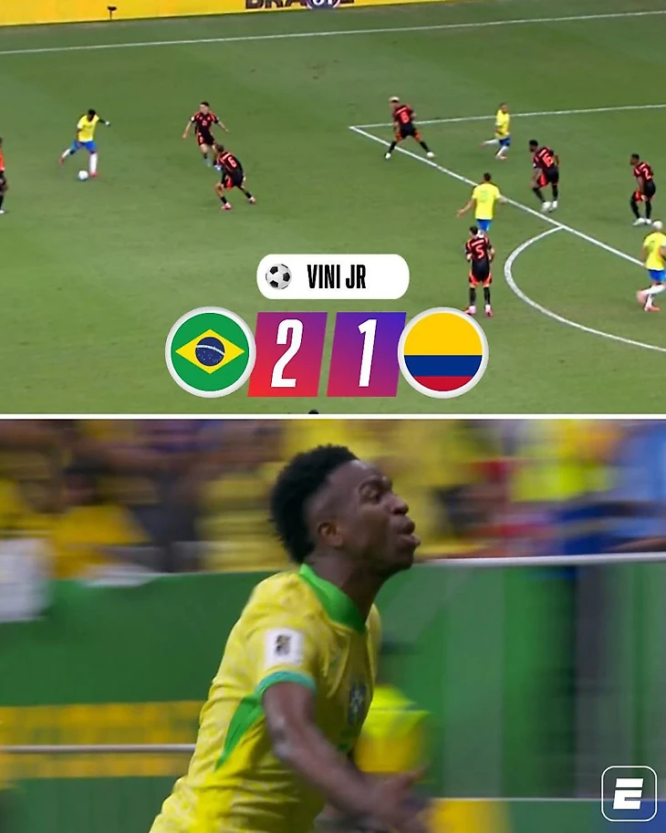 В начале второго тайма Бразилии удалось избежать этого удушья. Во-первых, потому что она нашел интересные пути длинных передач на Вини и Рафинью от защитников и Бруно, а во-вторых, из-за снижения интенсивности давления со стороны колумбийцев. В первые десять минут команде удалось провести две хорошие атаки на скорости. В обоих случаях Камило Варгас выручил после ударов Рафиньи и Вини.